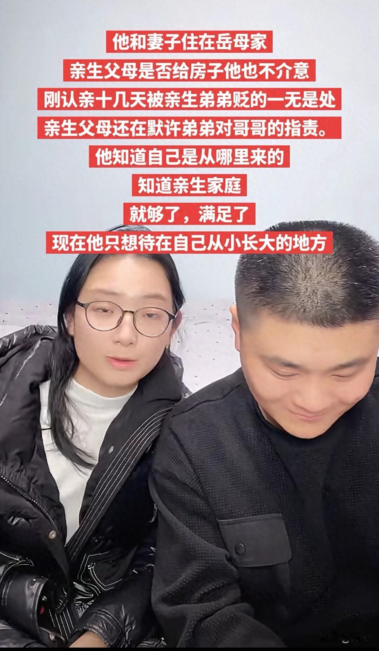 还记得哥哥跟他们住在一起那几天,弟弟和哥哥聊天,说爸妈认亲那天给的红包是借钱包的。让哥哥去买菜,只给了50块钱,说是给房子,但是一直都没有行动。