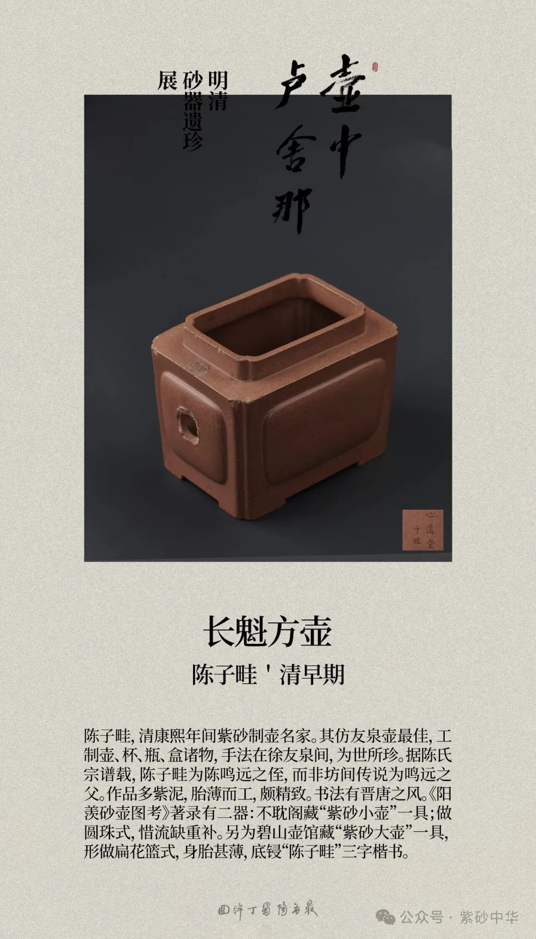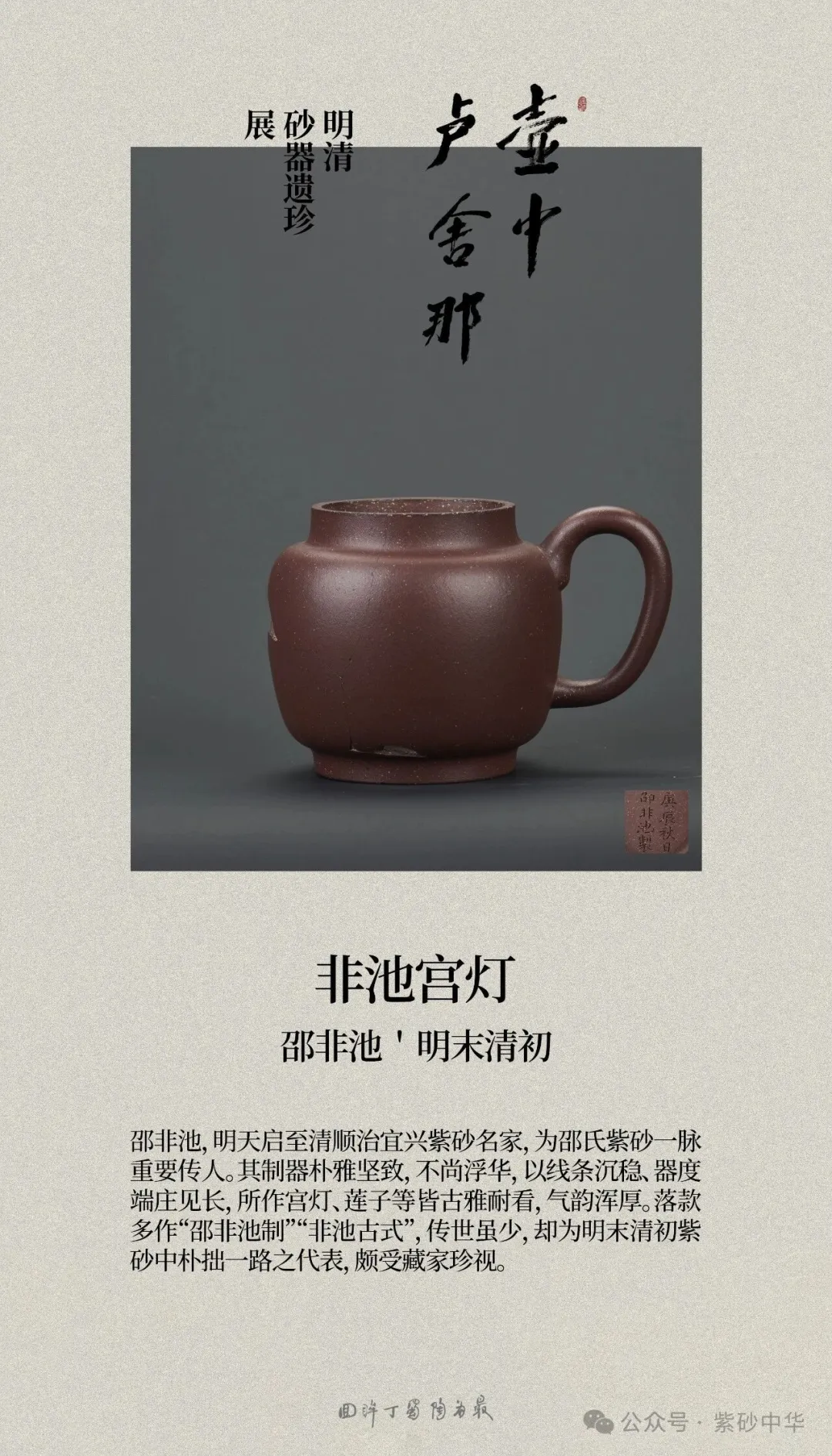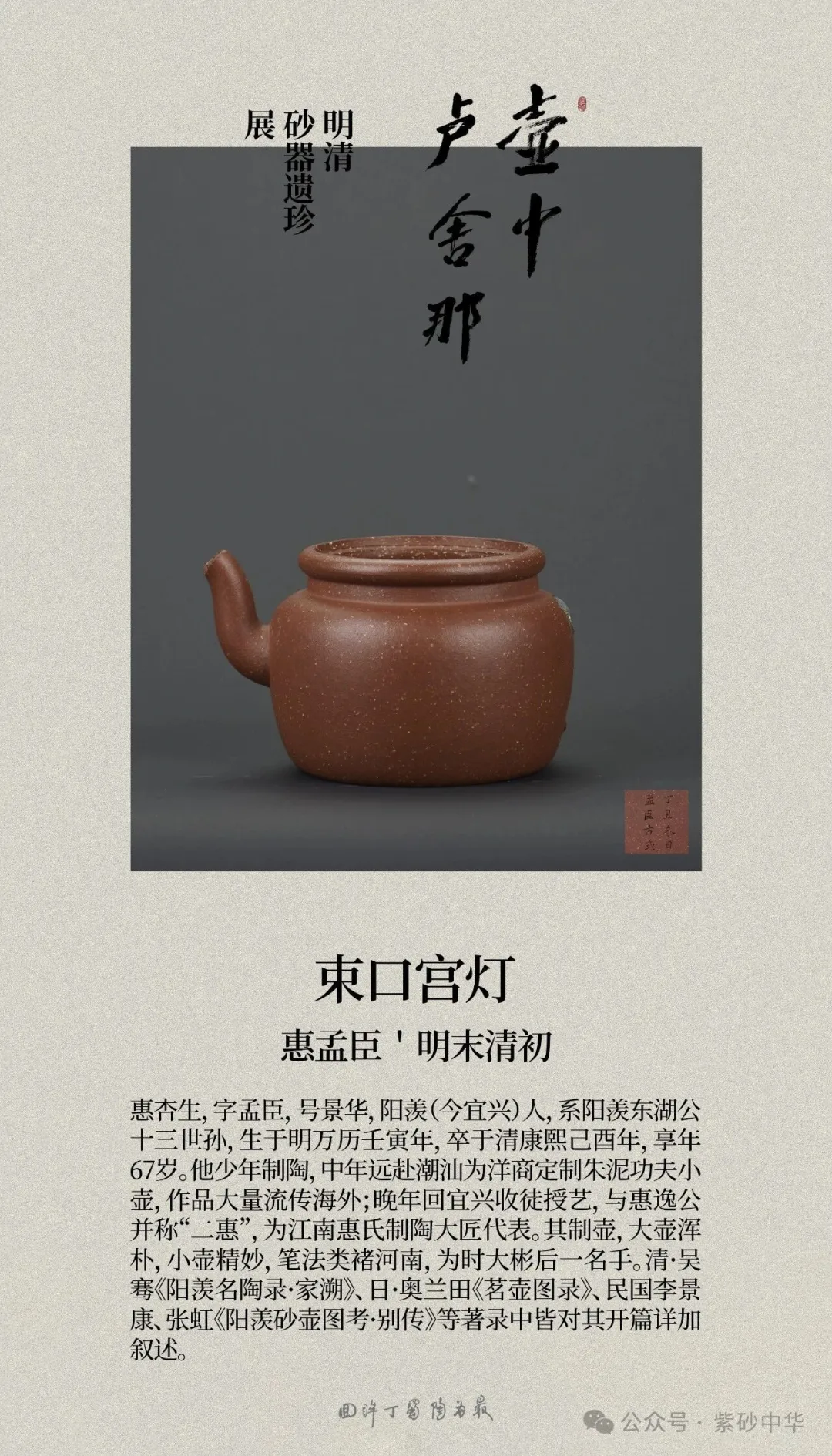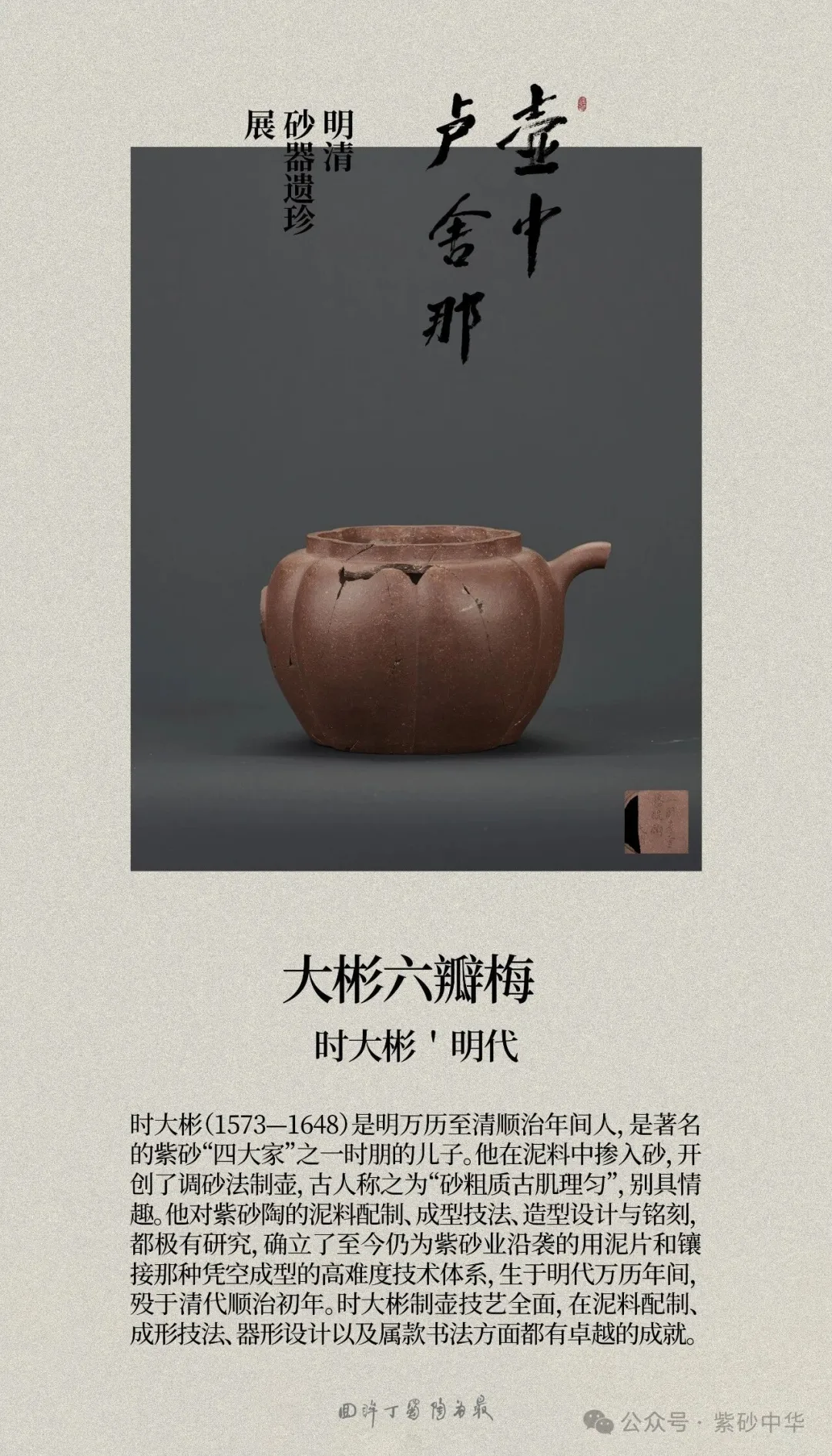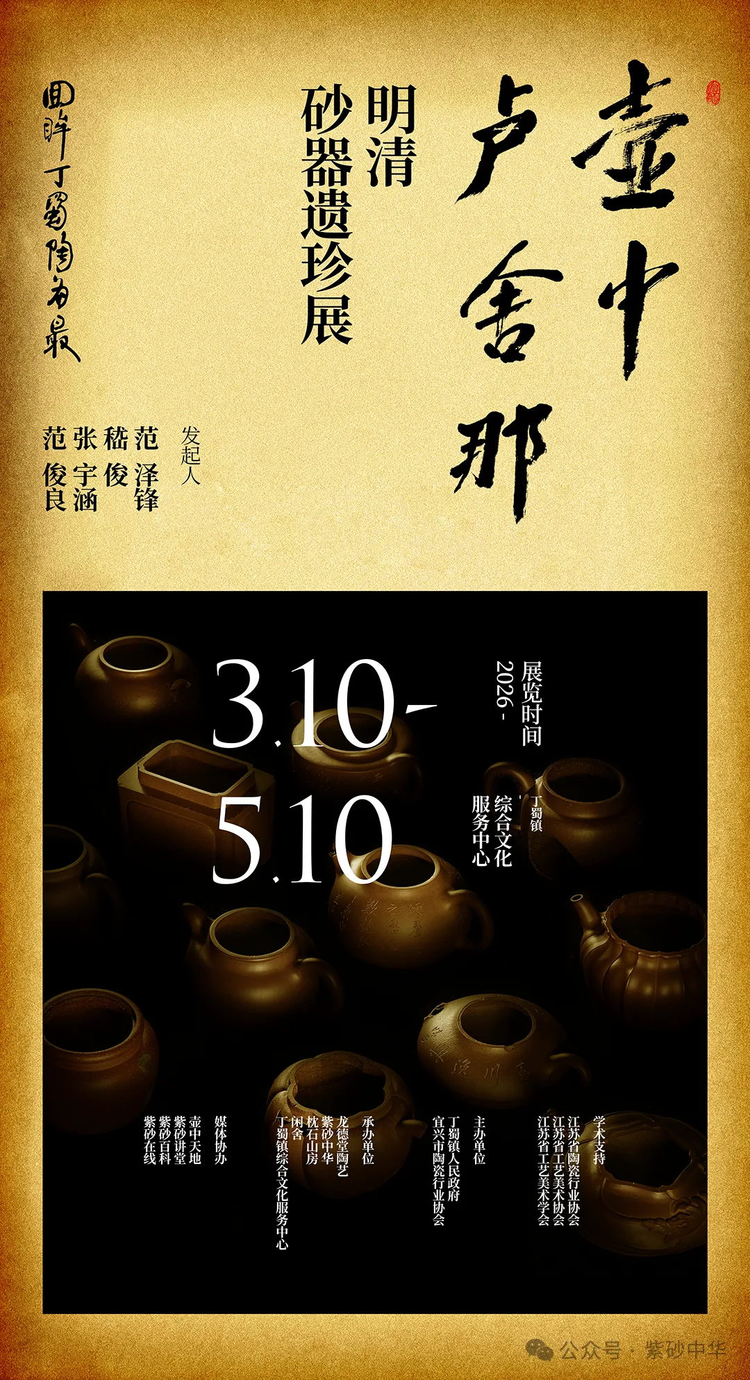 《壶中卢舍那》明清砂器遗珍展,由范泽锋、范俊良、嵇俊、张宇涵共同发起,以整理、研究明清紫砂残器遗珍为宗旨,聚焦宜兴的砂器残件,全面呈现明清紫砂工艺遗存的真实面貌。
