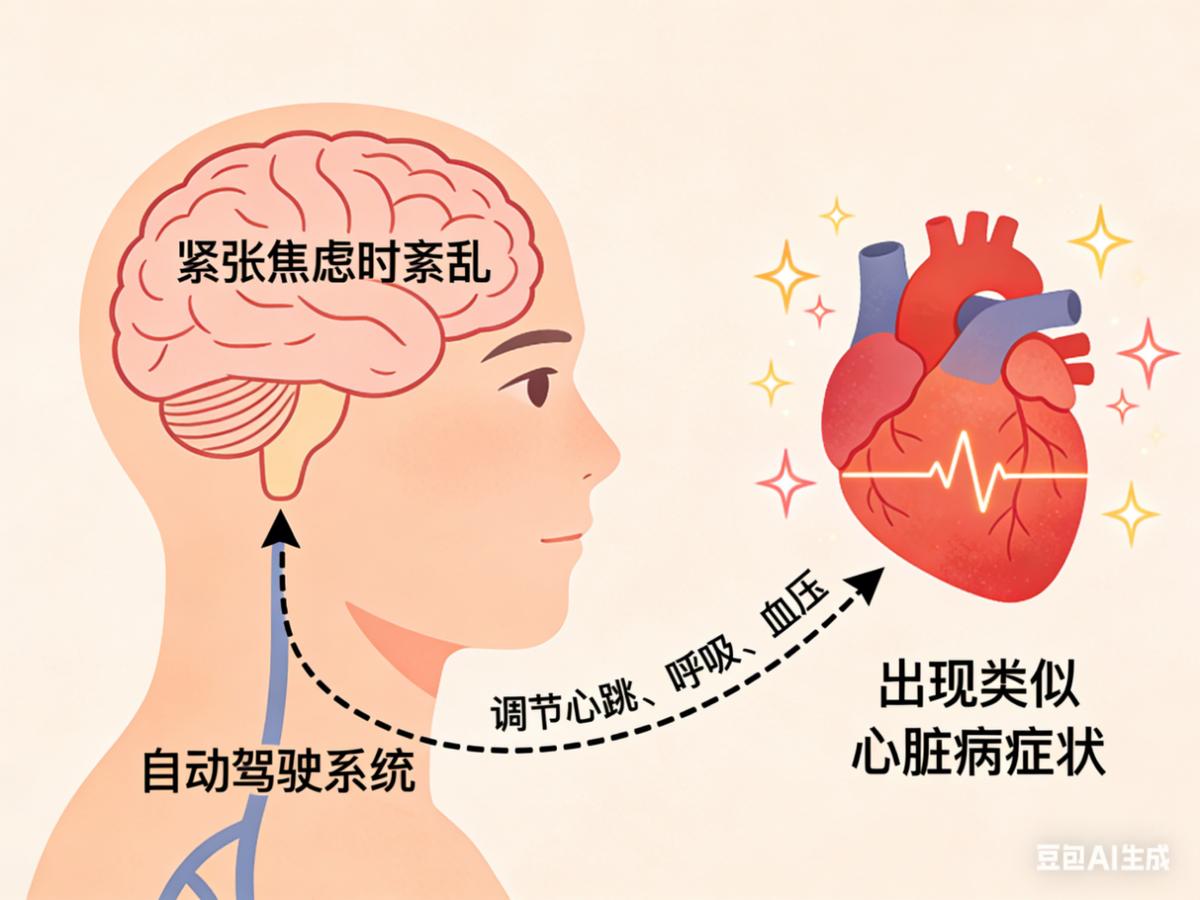 当人在紧张、焦虑或压力大时,大脑皮层和植物神经功能会发生紊乱。植物神经就像身体的“自动驾驶系统”,自动调节心跳、呼吸、血压等。一旦这个系统失调,即使没有真正的危险,它也会向心脏发出错误的指令,导致心脏出现一系列类似心脏病的症状。