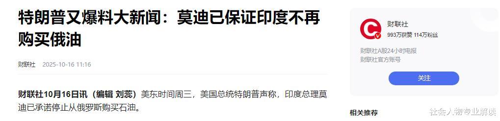 一觉醒来,川普向世界爆了一个大瓜,莫迪在10月15日亲口向他保证,会停止购买俄油。