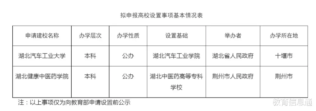 12月8日,湖北省教育厅官网发布《关于拟申报高校设置事项的公示》,根据《中华人民共和国高等教育法》《普通本科学校设置暂行规定》《教育部关于“十四五”时期高等学校设置工作的意见》等有关规定,经评议,现对拟向教育部申报设置“湖北汽车工业大学”“湖北健康中医药学院”等2个事项予以公示。