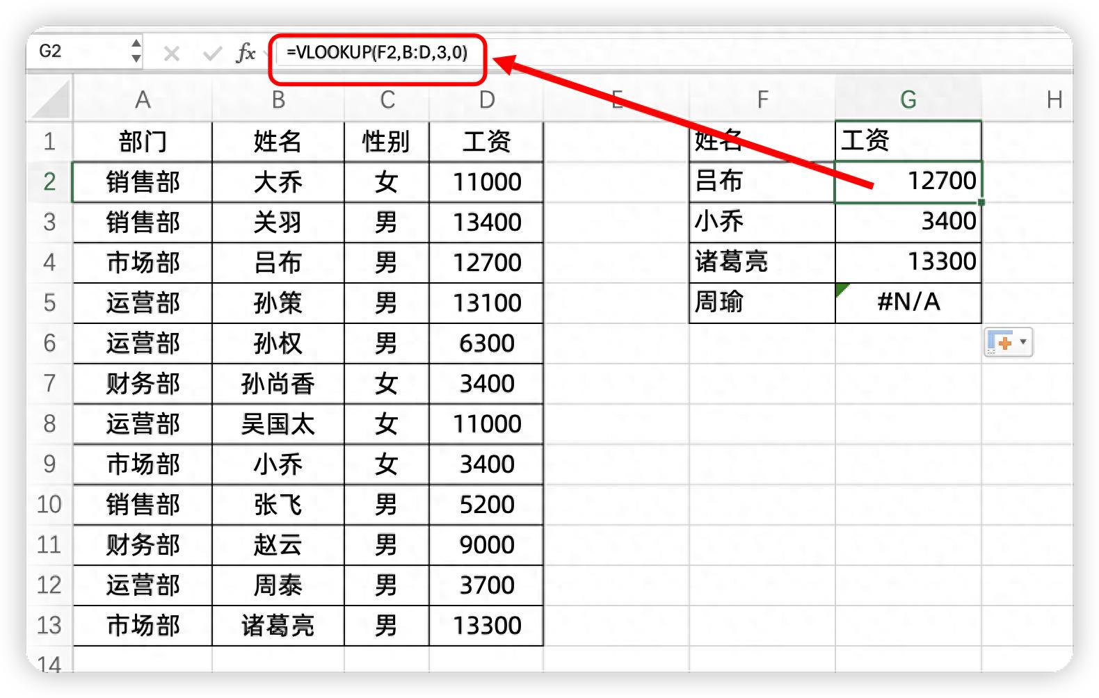 第三参数是查找第几列的结果,需要从B列开始向右数,第3列,工资列是我们的结果。