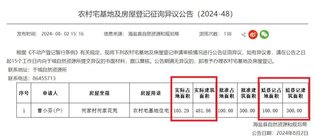 在公告中的表格里,大家能清楚地看到:批准占地面积是100平方米、建筑面积是300平方米;实际占地面积105.29平方米、建筑面积是481.86平方米;拟登记的占地面积是100平方米、建筑面积是300平方米。