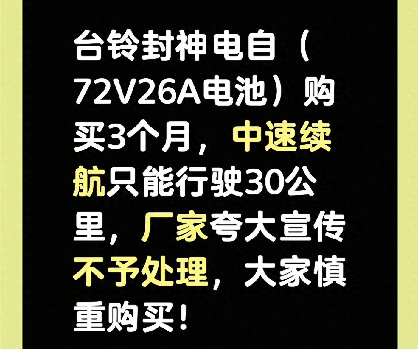 遇到这种事谁都会心烦,更让人窝火的是找商家理论对方还置之不理。近日刷抖音时,看到一位车友分享了糟心经历:三个月前刚入手全新台铃风神电动车,搭载官方宣称的72V26Ah蓝鲸动力电池,新车时满心期待长续航,可仅用三个月,中速模式下续航就从宣称的80多公里骤降至30公里,原本能跑大半天的路程,现在半路没电成了家常便饭。