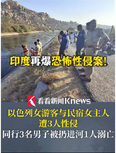 3.6日,印度卡纳塔克邦(班加罗尔附近),一名以色列女游客以及民宿老板娘在三位男性(2个印度人,一个美国人)的陪伴下,一起去河边看夜景。三名犯罪嫌疑人见状,向他们索要100卢比(人民币8块钱),但被拒绝。之后,三名嫌疑犯将三名男子推入河中,并对两名女性实行了轮流性侵。之后,还抢走了他们的手机以及现金。第二天,有人发现,被推入河中的一名印度男子死亡。