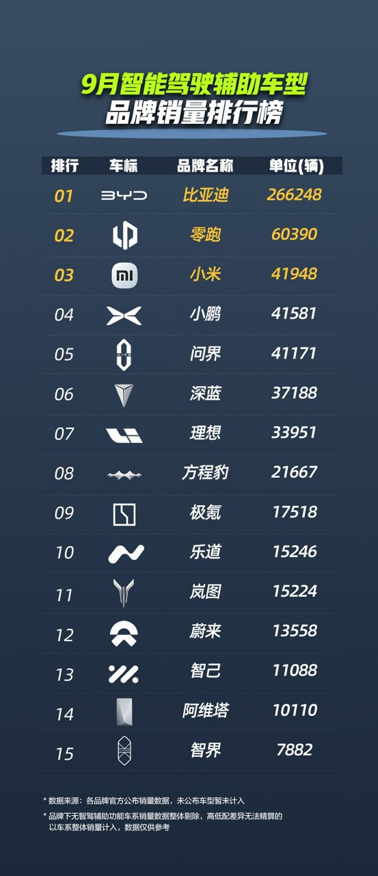 在太平洋汽车发布的9月智能驾驶辅助车型品牌销量榜中,比亚迪汽车荣登榜首,销量是第二名的4倍还多,优势断层领先。。