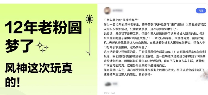 在某书上刷到一条一位东风风神老用户的帖子,帖子名字叫“12年老粉圆梦了,风神这次玩真的”。