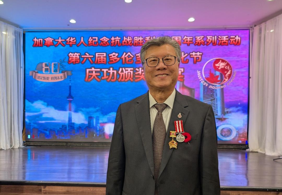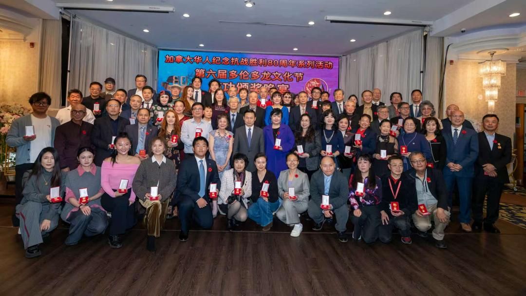 加拿大共工新闻社多伦多讯(记者董勇)当地时间11月5日晚,加拿大华人纪念抗战胜利80周年系列活动暨龙文化节庆功颁奖晚会在多伦多隆重举行。晚会由第六届多伦多龙文化节暨纪念世界反法西斯战争和中国人民抗日战争胜利80周年系列活动组委会主办。来自加拿大社会各界300余位嘉宾齐聚一堂,共同见证这一意义深远的重要时刻。加拿大共工新闻社社长孙瑞祥教授荣获纪念抗战胜利80周年系列活动荣誉勋章。