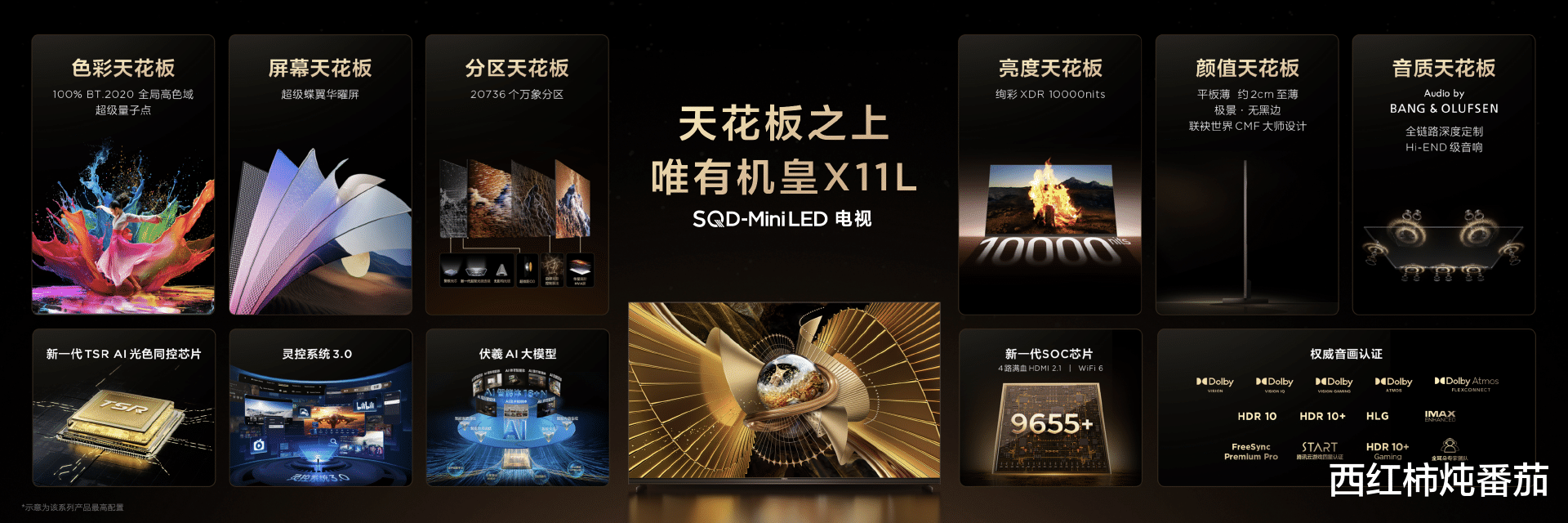 9月15日,TCL举办主题为“不颠覆不发布”的秋季新品发布会,划时代的SQD-Mini LED耀世登场,实现革命性的技术升级,全球首款采用这一技术的“真机皇”X11L SQD-Mini LED电视以及标杆级RGB-Mini LED电视Q10M Ultra、最值得买的RGB-Mini LED电视Q9M同步亮相。其中,首台搭载SQD-Mini LED技术的TCL X11L,成为当之无愧的年度机皇,为用户带来天花板级别的色彩、屏幕素质、分区、亮度、音质、颜值和智控体验。