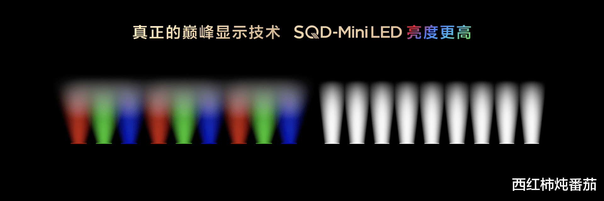 而在亮度层面,SQD-Mini LED也实现了对RGB-Mini LED电视的绝对碾压:后者需要三色发光芯片一组,才能混成白光,由于当前技术和成本的限制,在同样的温度条件下,其发光效率不如SQD-Mini LED的一颗灯。同成本同灯数下,SQD-Mini LED亮度比RGB-Mini LED更高。