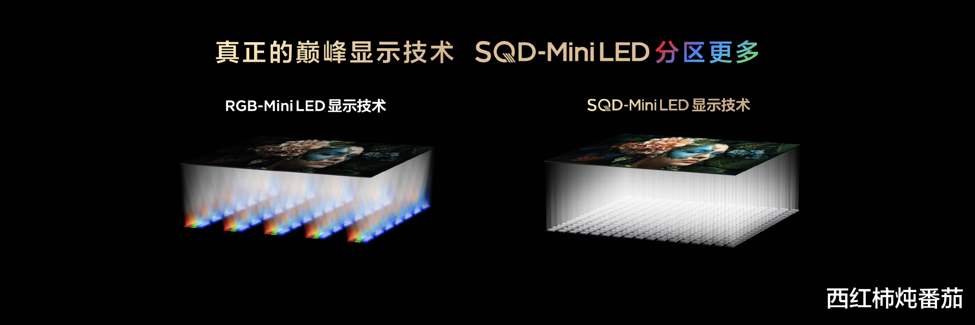 RGB-Mini LED电视的发光芯片由三色发光芯片组成,即三颗灯为一组才能发白光,而SQD-Mini LED一颗发光芯片就能发白光,一灯顶RGB-Mini LED三灯。同样成本,同样灯数,SQD-Mini LED比RGB-Mini LED分区更多。