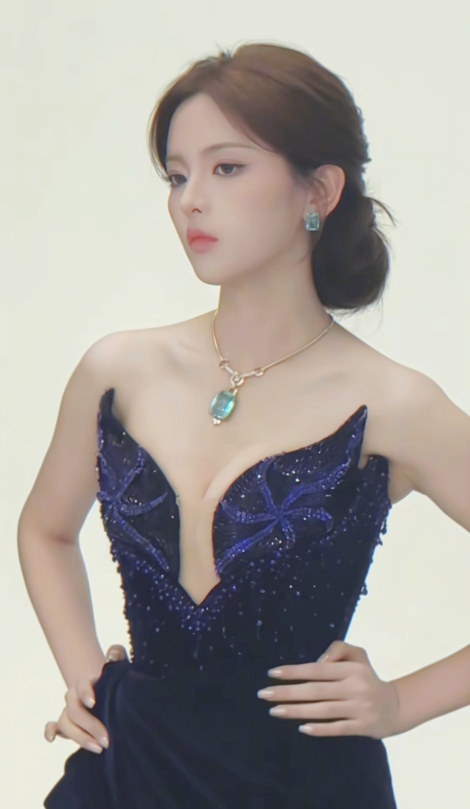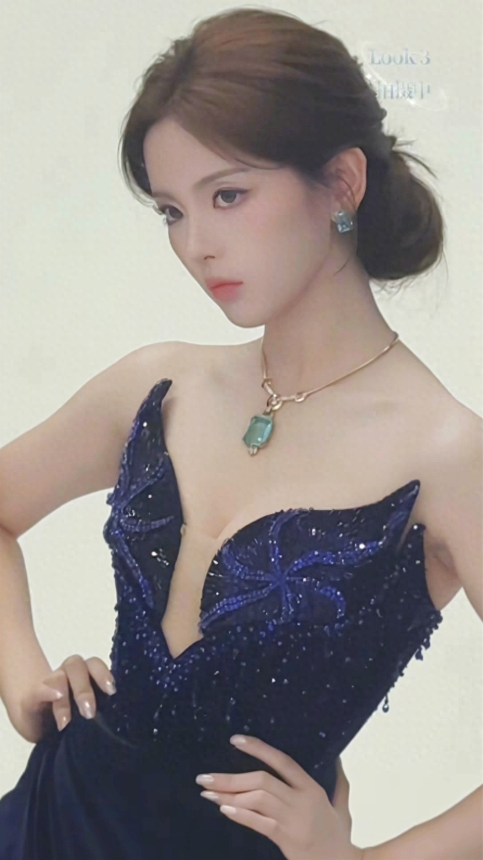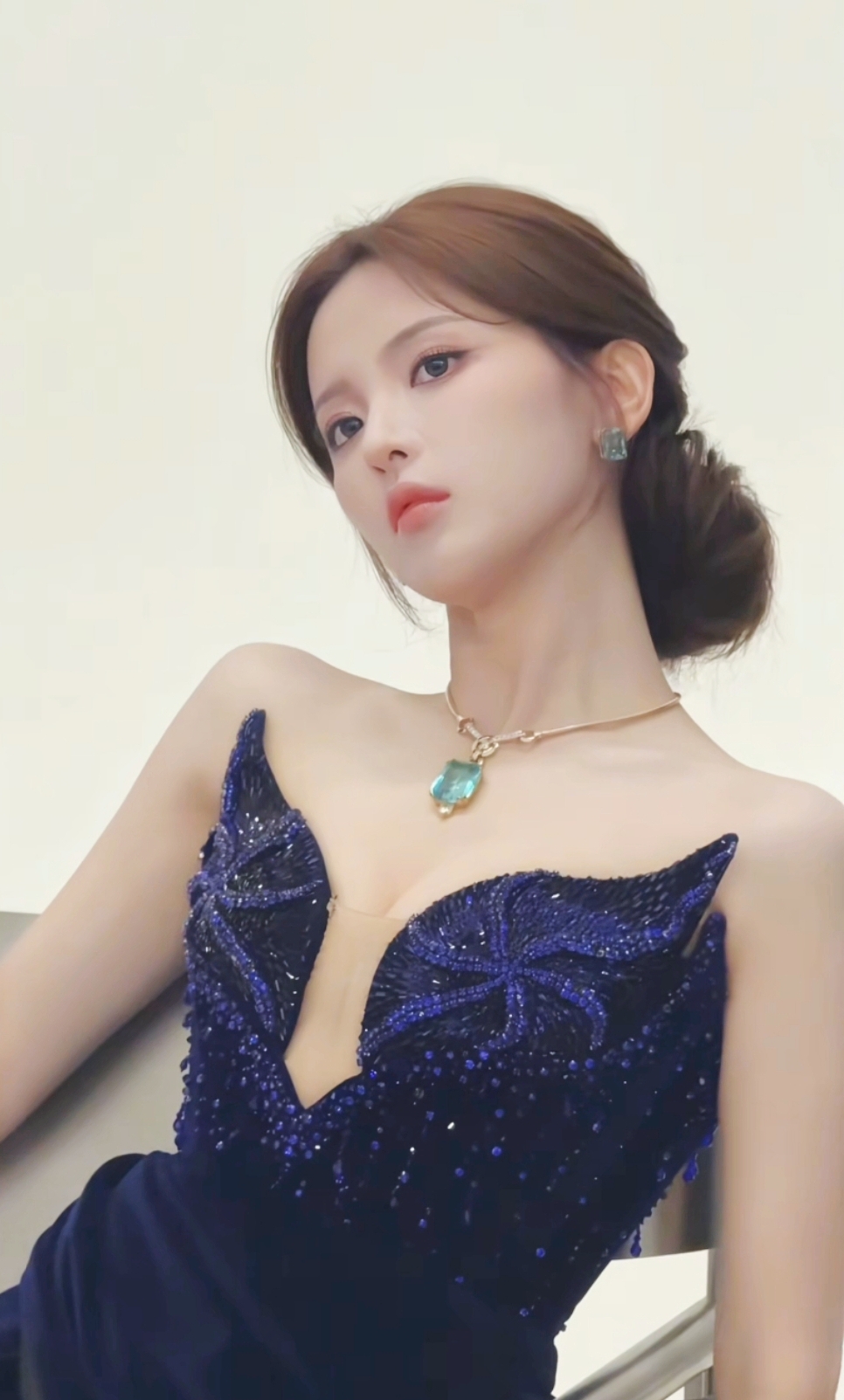 一袭深蓝色亮片礼裙加身,深V设计极具视觉张力,裙身如星河般璀璨闪耀。