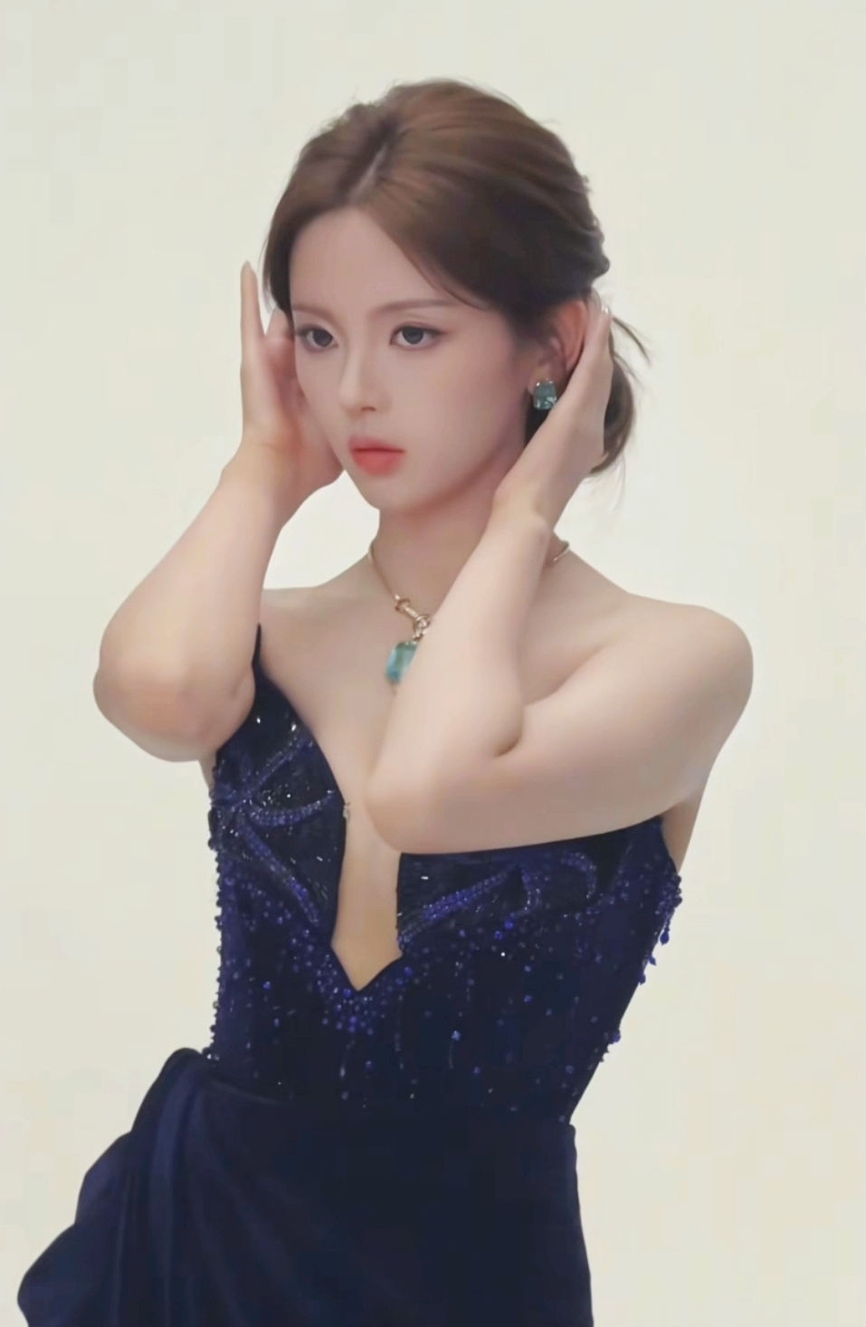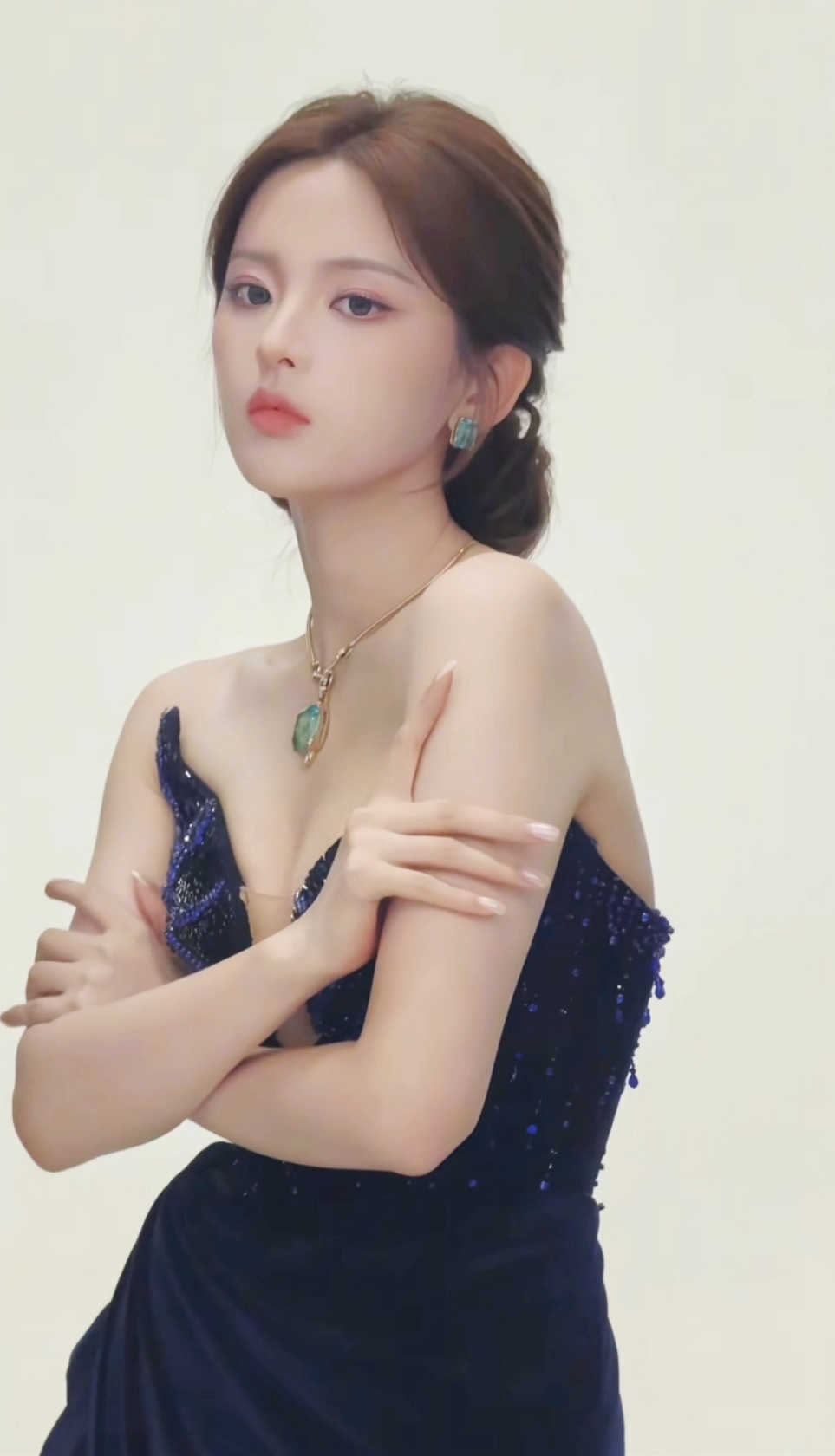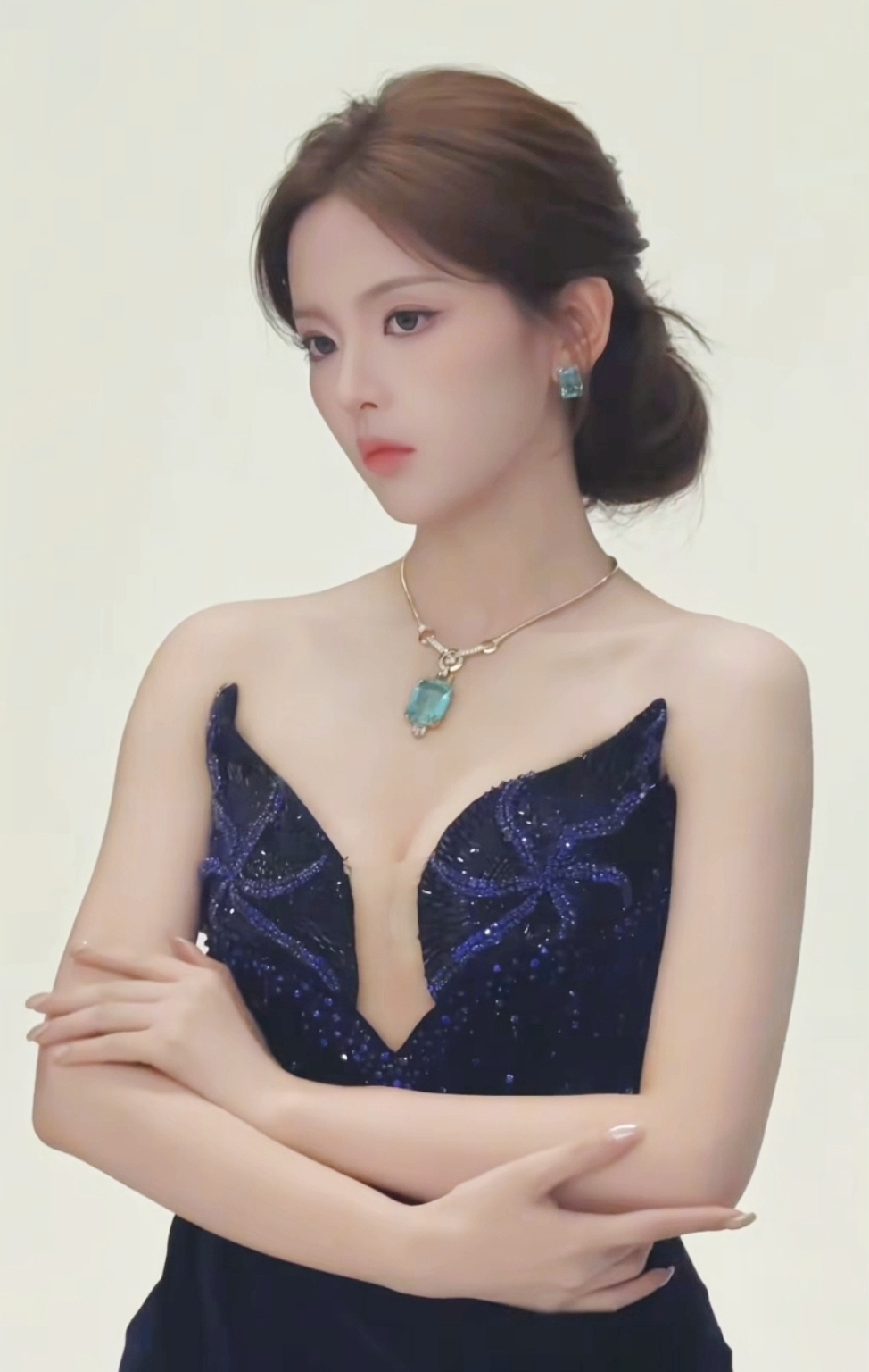 一袭深蓝色亮片礼裙加身,深V设计极具视觉张力,裙身如星河般璀璨闪耀。