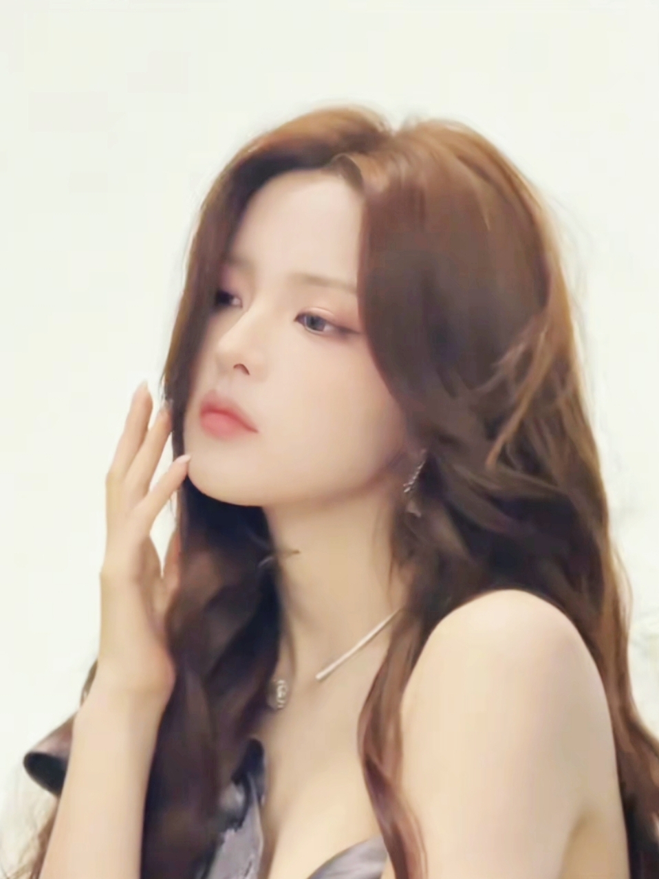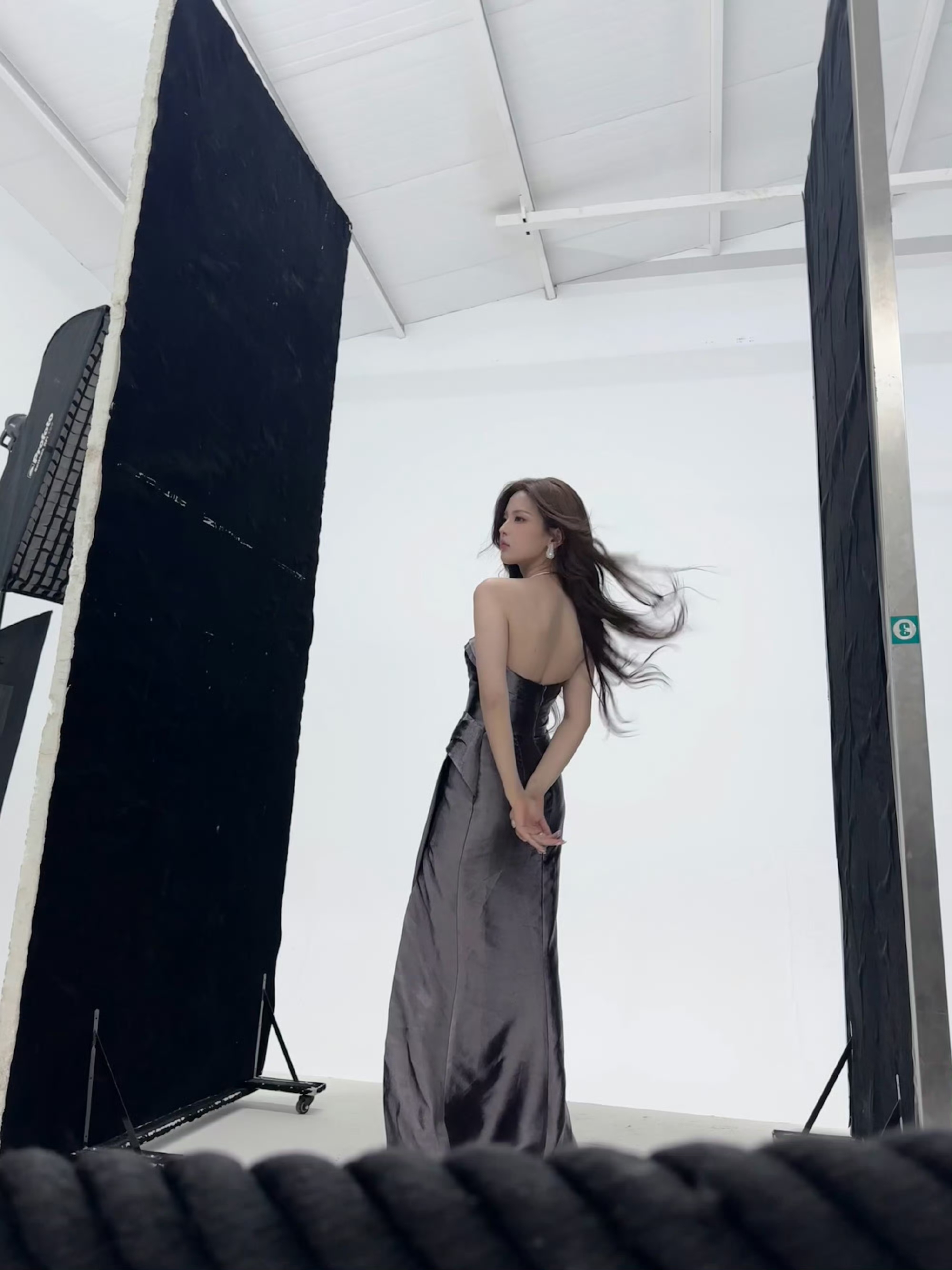 身着灰调单肩礼裙,层叠褶皱雾霭般轻盈,勾勒出曼妙曲线。