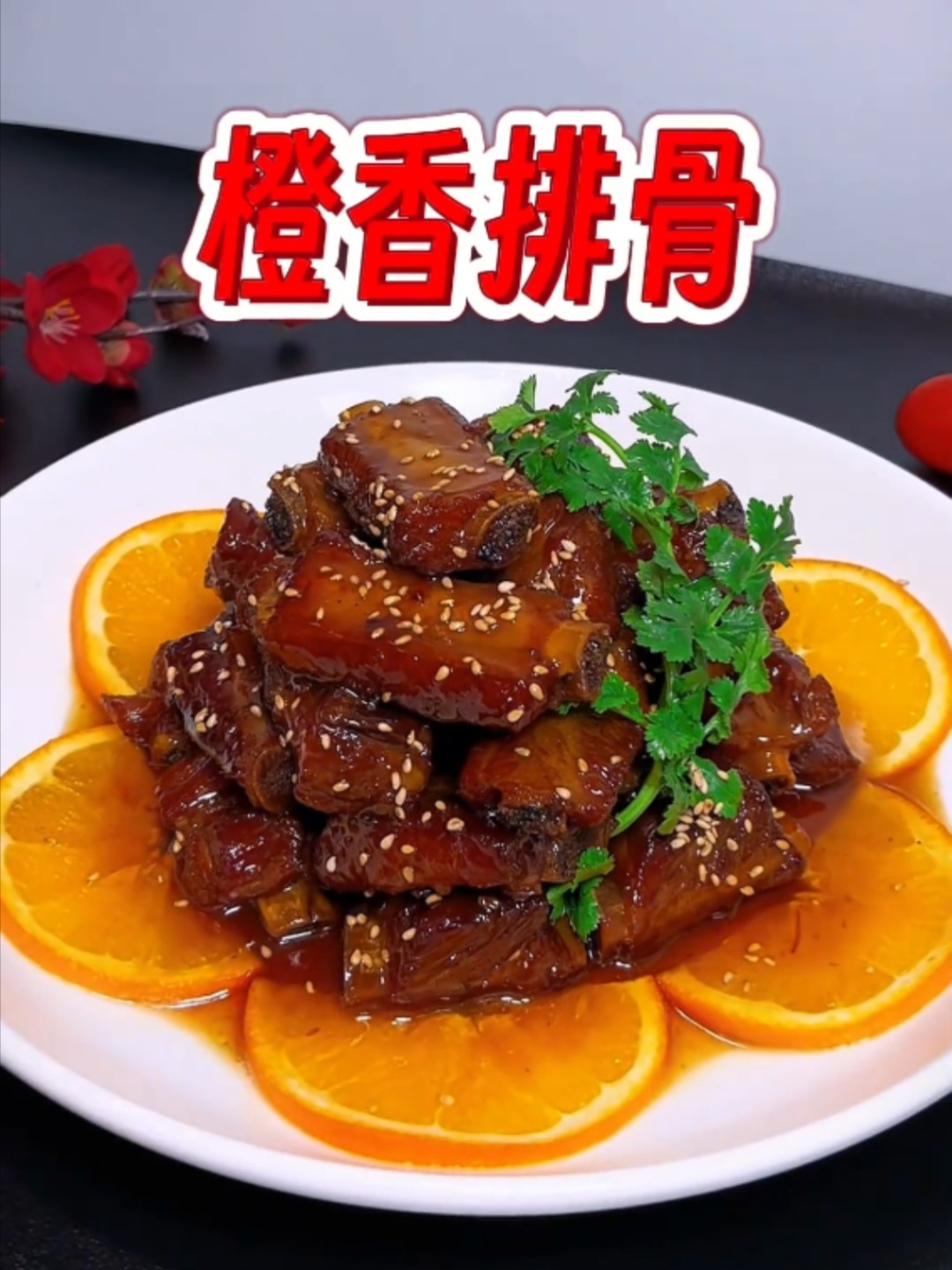 ④时间到之后,用筷子夹出橙子片并丢弃,然后新的橙子片放入盘中铺底,等到锅中汁水浓稠,排骨出锅的时候放入橙子片上,撒入芝麻和香菜点缀,这道美食就制作好了。