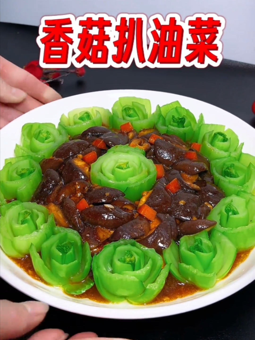 ②把香菇对半切开,放入锅中,再放一些胡萝卜丁,烫软之后捞出,之后起锅烧水,五成油温放入蒜末,再放入香菇和胡萝卜,翻炒均匀再调味,放入蚝油,老抽,生抽,还有食用盐和鸡精,还有淀粉,以及少量饮用水。③开大火翻炒均匀,收汁,等待锅中汁水浓稠就出锅装盘,摆放在油菜梗的圆圈内,随后在香菇中间再放一朵菜梗,这道美食就制作好了。