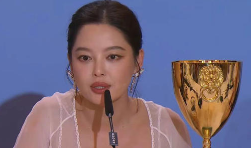 感谢团队,谢谢他们一直以来像家人一样爱护她、保护她,希望她好。然后要感谢家人,想对妈妈说,你看。辛芷蕾举起了奖杯,要给远方的妈妈看。