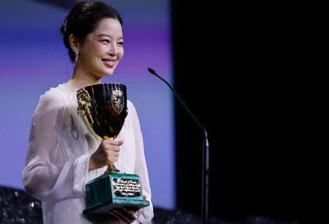 辛芷蕾用中文发表获奖感言,她可能没有像其他演员一样学习英文,她非常感谢威尼斯国际电影节能把这个奖颁给她,感谢所有的评委老师们能喜欢她的表演,喜欢她的电影。