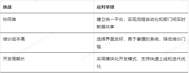 MES生产管理系统开发过程中通常面临三大挑战:部门协同困难导致数据孤岛现象;员工传统工作习惯难以改变,培训成本较高;系统开发周期长,投入成本高昂。