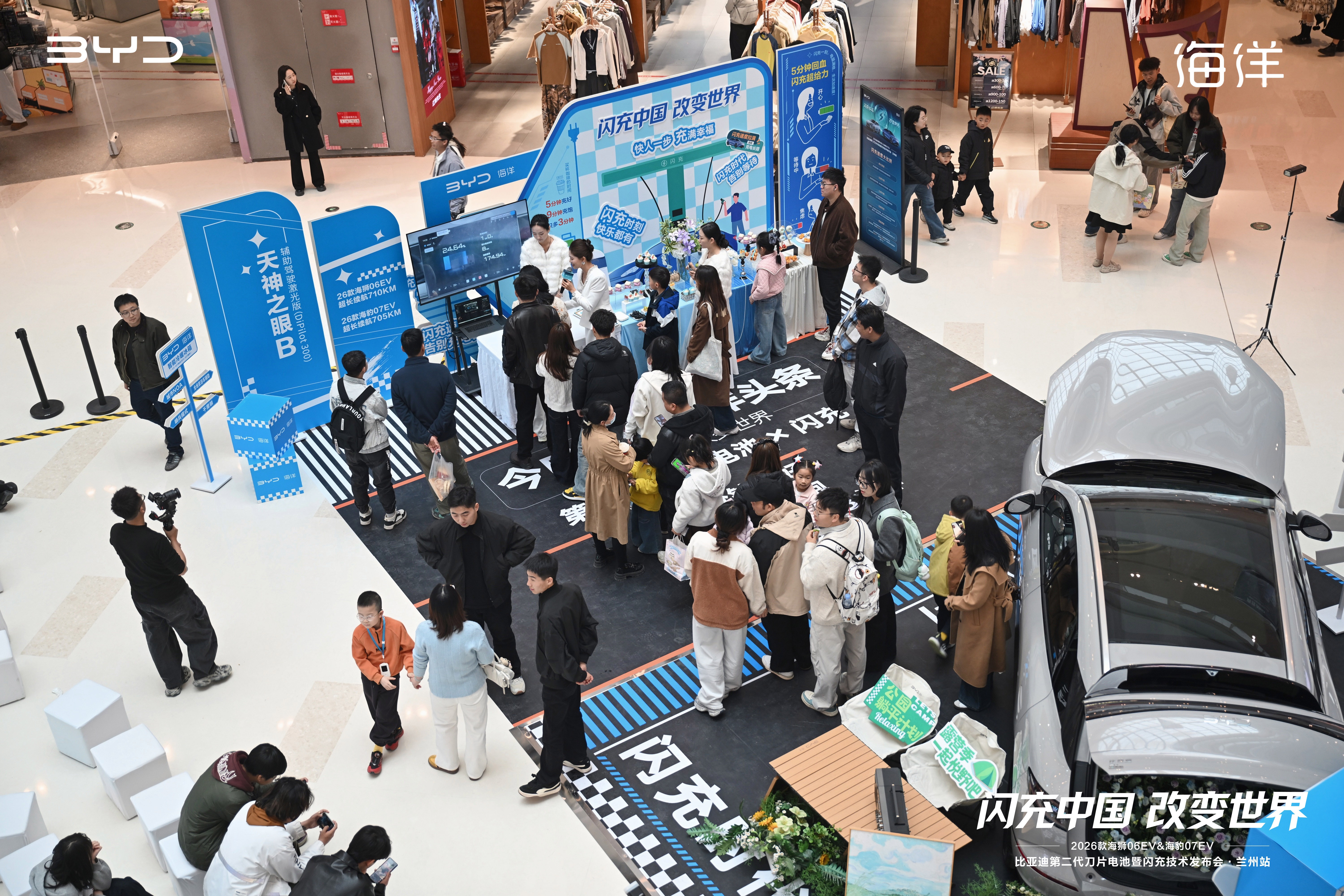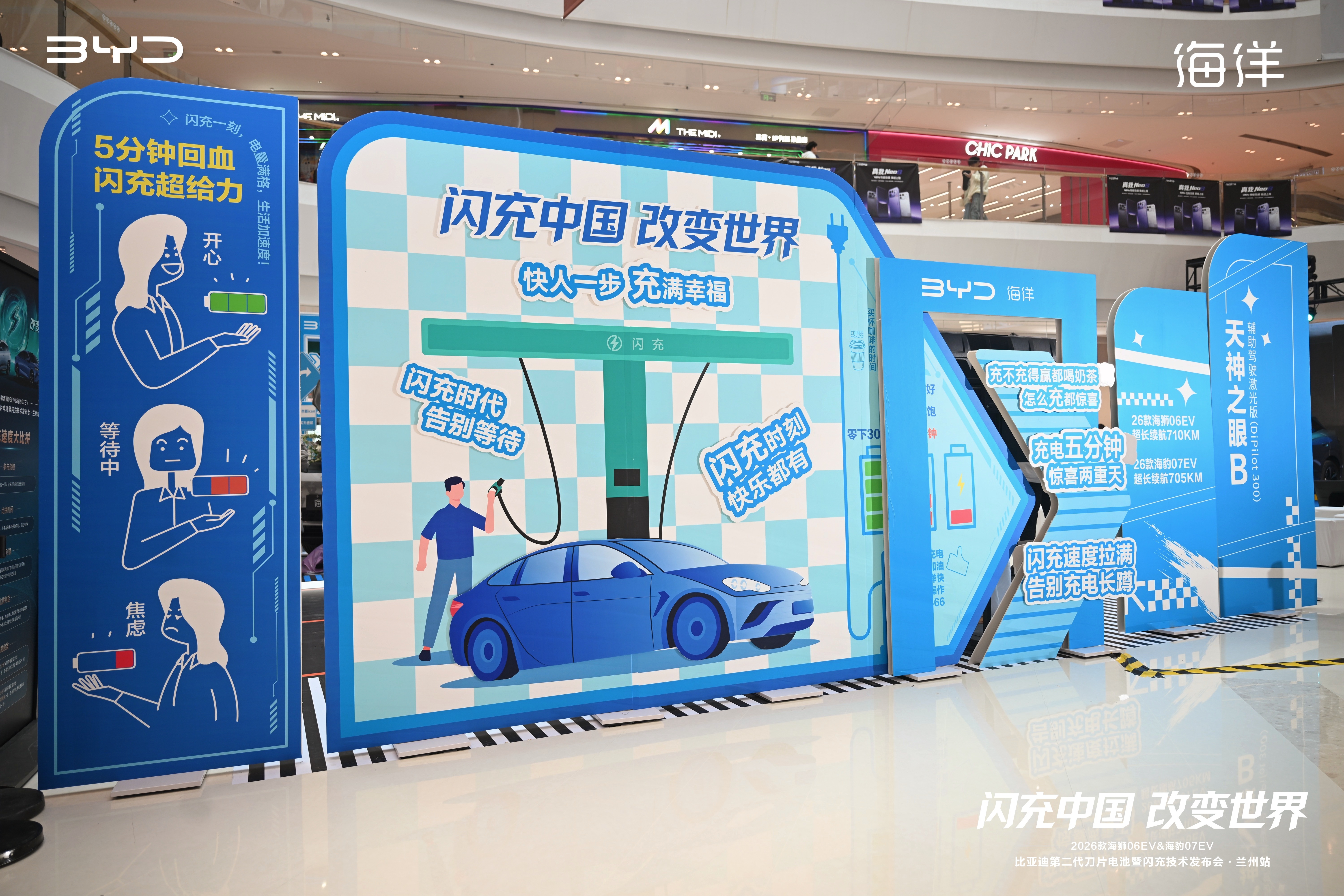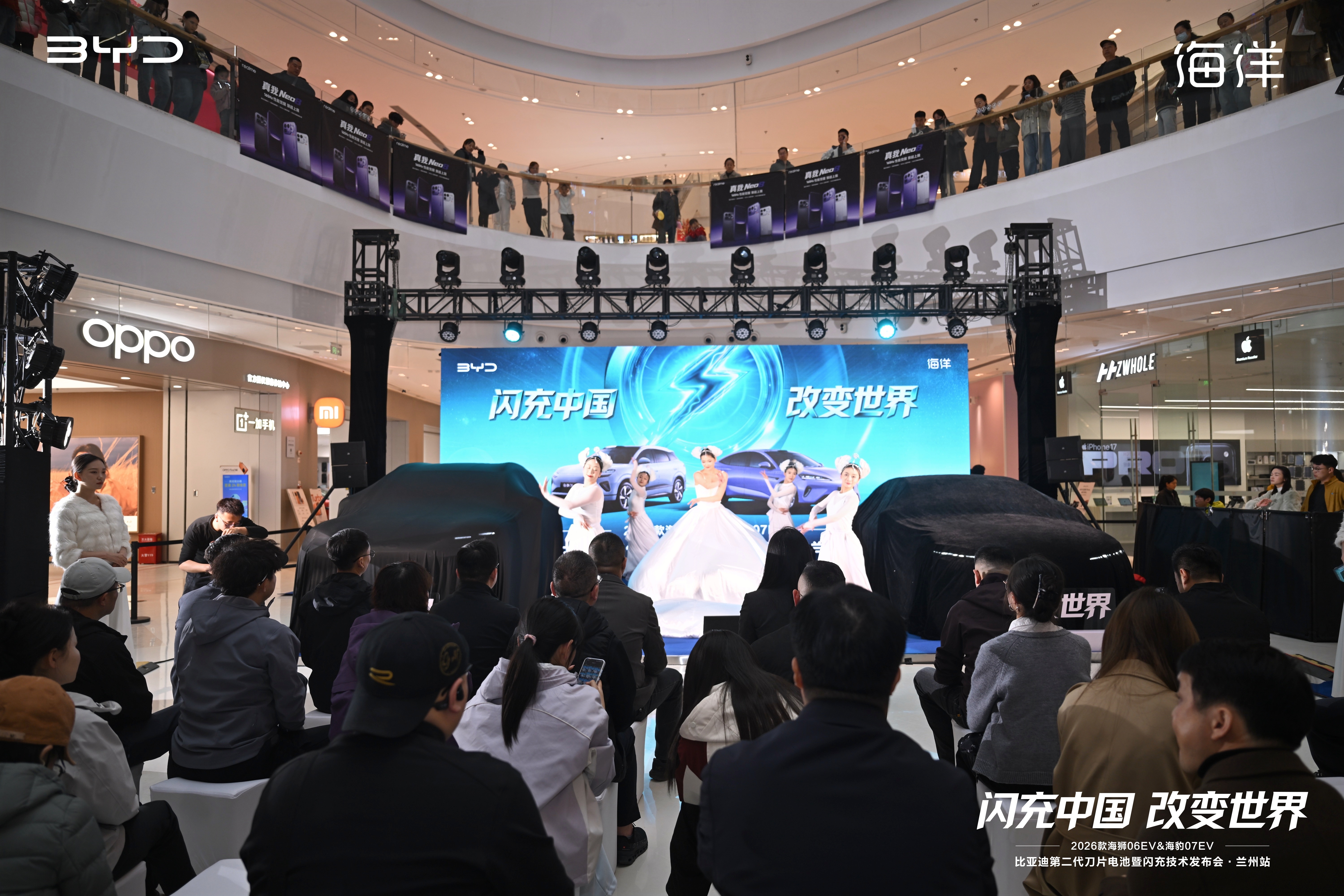 春启金城,智领未来。3月21日,兰州吾悦广场被“闪充蓝”与海洋元素全景包裹,“闪充中国 改变世界——比亚迪第二代刀片电池暨闪充技术发布会·兰州站”正式启幕。这场兼具科技感与地域温度的发布会,不仅重磅发布颠覆性的第二代刀片电池及闪充技术,更将首批搭载该技术的2026款海狮06EV与海豹07EV正式带入兰州市场,以“充电如加油”的全场景出行体验,破解西北用户新能源出行痛点,为兰州新能源汽车产业发展注入强劲动力。