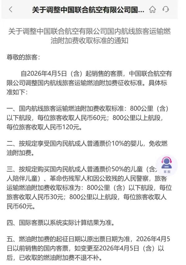 燃油附加费调整以订单时间为准,4月5日零时前完成出票的订单,即便航班在4月5日及之后起飞,仍按现行标准收取。