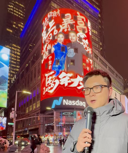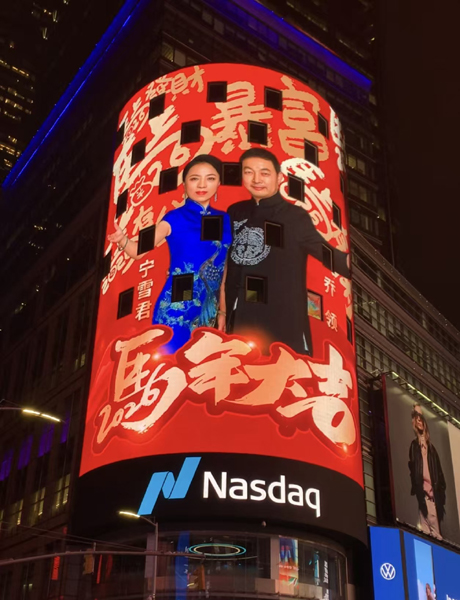 纽约时间2026年2月18日,中国农历丙午正月初一。在曼哈顿时代广场巨大的荧屏上,乔领、宁雪君向全球华人致以中国农历新年的春节祝福。