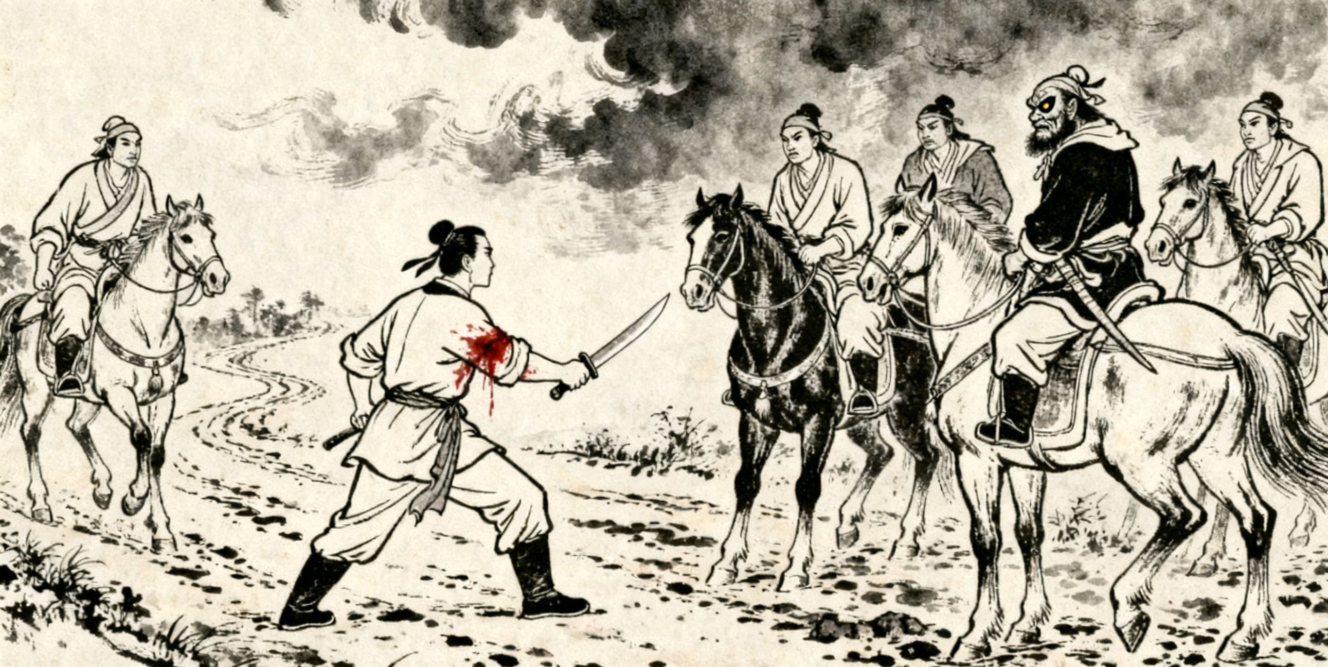 柳冲握着短刀,迎着强盗冲了上去。他身手矫健,短刀在手中舞得密不透风,可强盗人多势众,又都手持利器,没过多久,柳冲的胳膊就被砍中一刀,鲜血瞬间染红了衣袖。他咬着牙坚持,却终是寡不敌众,被强盗们打翻在地,短刀也被踢飞老远。