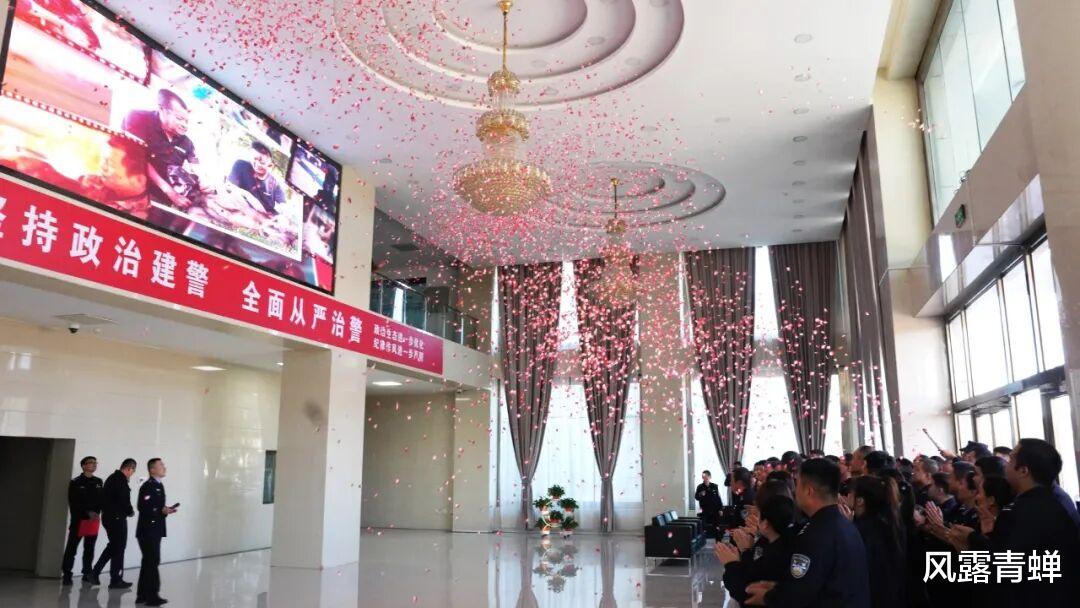 相关领导为李建新送上鲜花和退休纪念碑,代表职业生涯的结束,同时是对下一代辅警奉献的敬意。