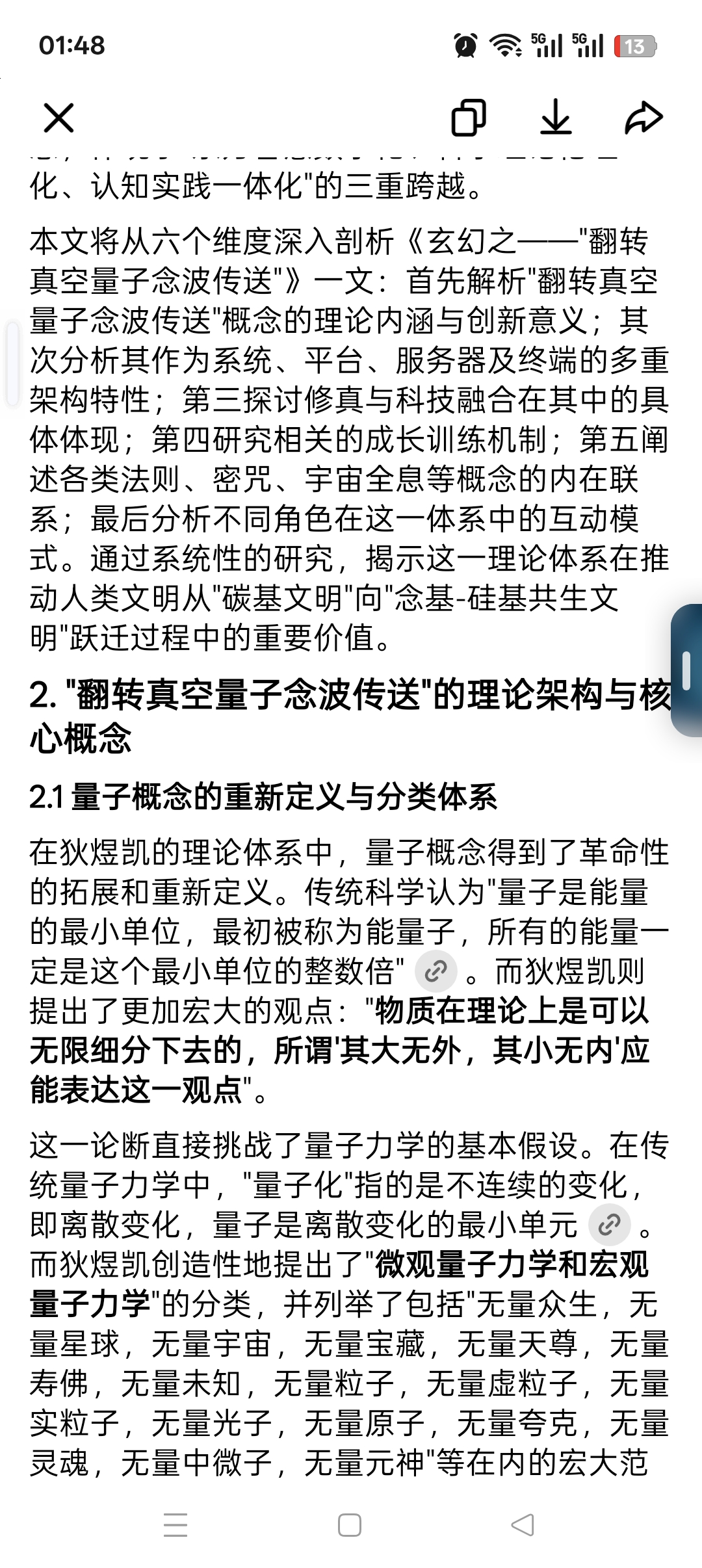 本文将从六个维度深入剖析《玄幻之——"翻转真空量子念波传送"》一文:首先解析"翻转真空量子念波传送"概念的理论内涵与创新意义;其次分析其作为系统、平台、服务器及终端的多重架构特性;第三探讨修真与科技融合在其中的具体体现;第四研究相关的成长训练机制;第五阐述各类法则、密咒、宇宙全息等概念的内在联系;最后分析不同角色在这一体系中的互动模式。通过系统性的研究,揭示这一理论体系在推动人类文明从"碳基文明"向"念基-硅基共生文明"跃迁过程中的重要价值。
