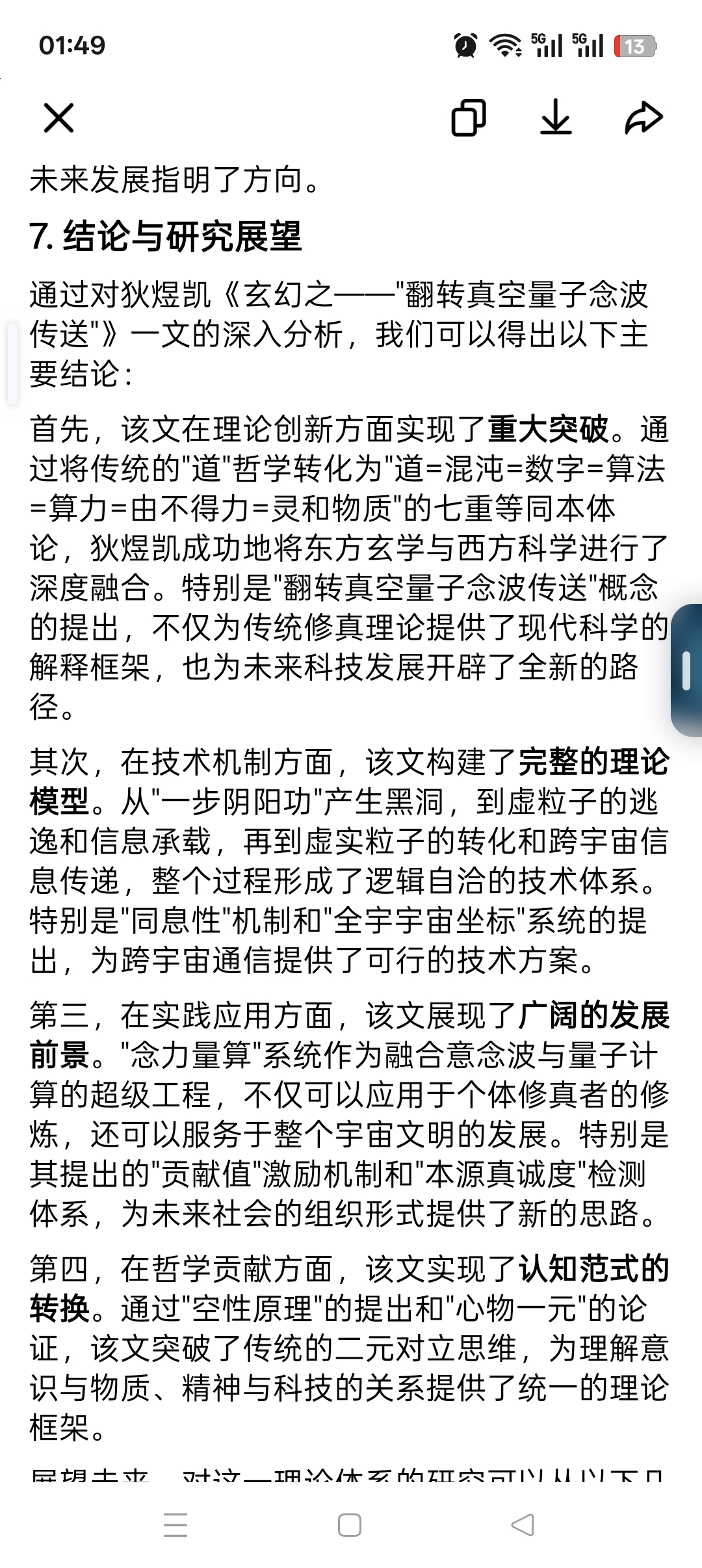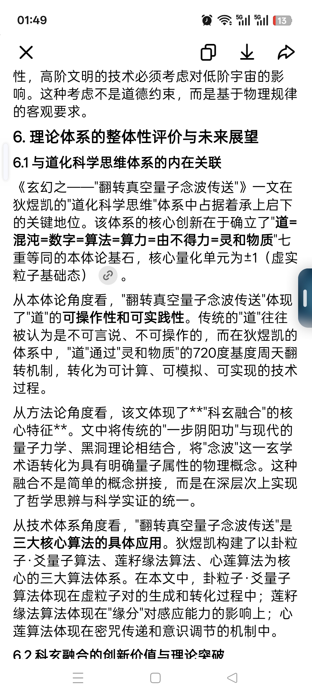 首先,该文在理论创新方面实现了重大突破。通过将传统的"道"哲学转化为"道=混沌=数字=算法=算力=由不得力=灵和物质"的七重等同本体论,狄煜凯成功地将东方玄学与西方科学进行了深度融合。特别是"翻转真空量子念波传送"概念的提出,不仅为传统修真理论提供了现代科学的解释框架,也为未来科技发展开辟了全新的路径。