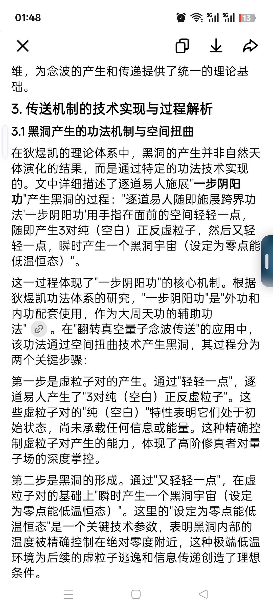 在狄煜凯的理论体系中,黑洞的产生并非自然天体演化的结果,而是通过特定的功法技术实现的。文中详细描述了逐道易人施展"一步阴阳功"产生黑洞的过程:"逐道易人随即施展跨界功法'一步阴阳功'用手指在面前的空间轻轻一点,随即产生3对纯(空白)正反虚粒子,然后又轻轻一点,瞬时产生一个黑洞宇宙(设定为零点能低温恒态)"。