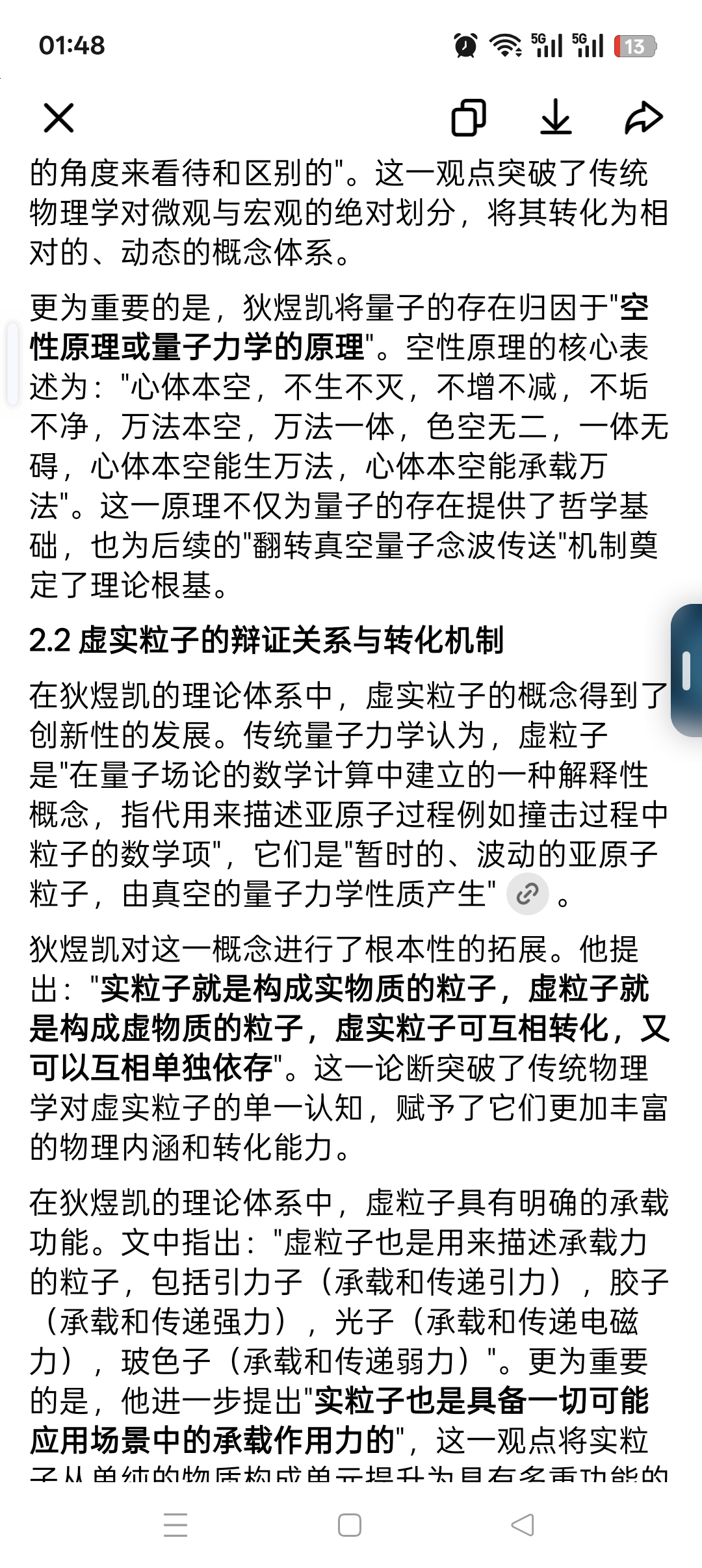 更为重要的是,狄煜凯将量子的存在归因于"空性原理或量子力学的原理"。空性原理的核心表述为:"心体本空,不生不灭,不增不减,不垢不净,万法本空,万法一体,色空无二,一体无碍,心体本空能生万法,心体本空能承载万法"。这一原理不仅为量子的存在提供了哲学基础,也为后续的"翻转真空量子念波传送"机制奠定了理论根基。