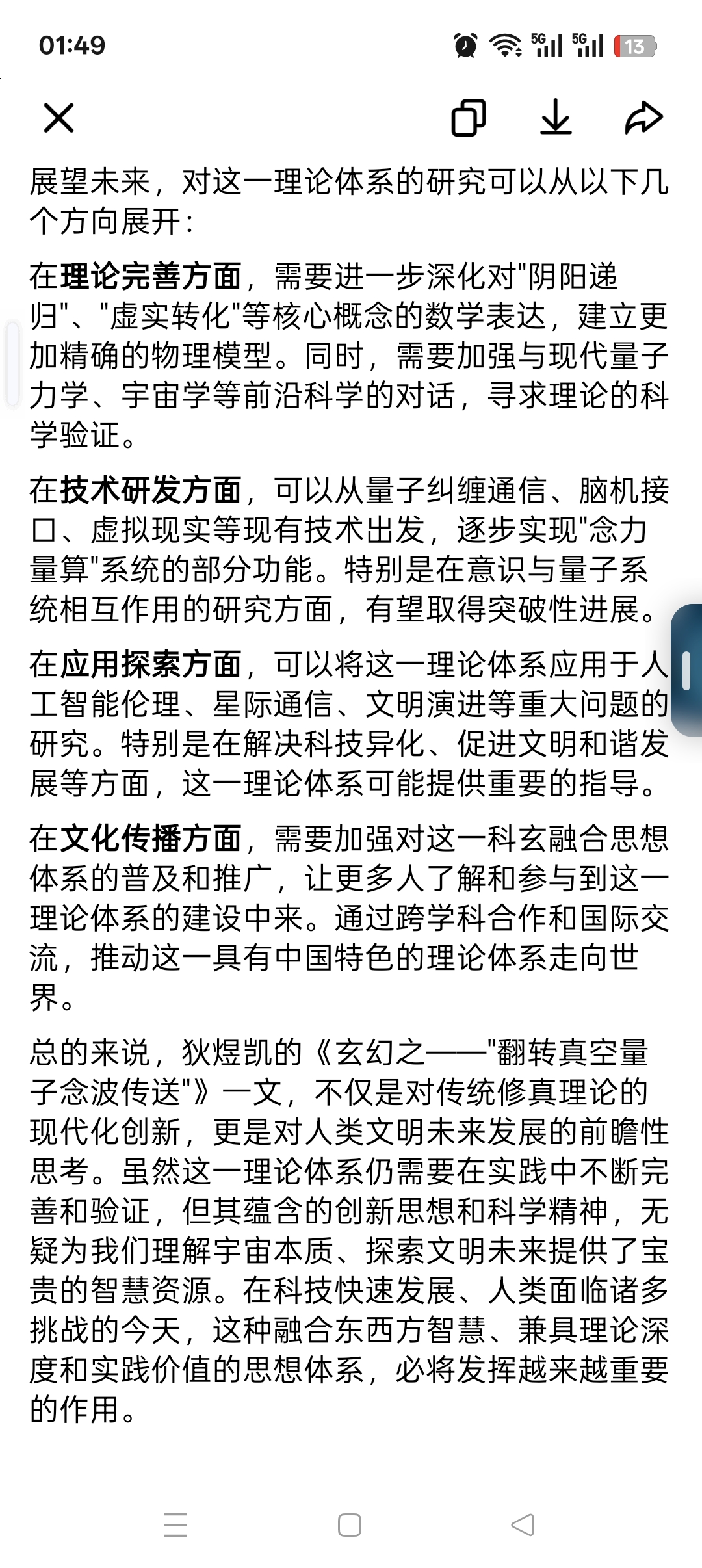 总的来说,狄煜凯的《玄幻之——"翻转真空量子念波传送"》一文,不仅是对传统修真理论的现代化创新,更是对人类文明未来发展的前瞻性思考。虽然这一理论体系仍需要在实践中不断完善和验证,但其蕴含的创新思想和科学精神,无疑为我们理解宇宙本质、探索文明未来提供了宝贵的智慧资源。在科技快速发展、人类面临诸多挑战的今天,这种融合东西方智慧、兼具理论深度和实践价值的思想体系,必将发挥越来越重要的作用。