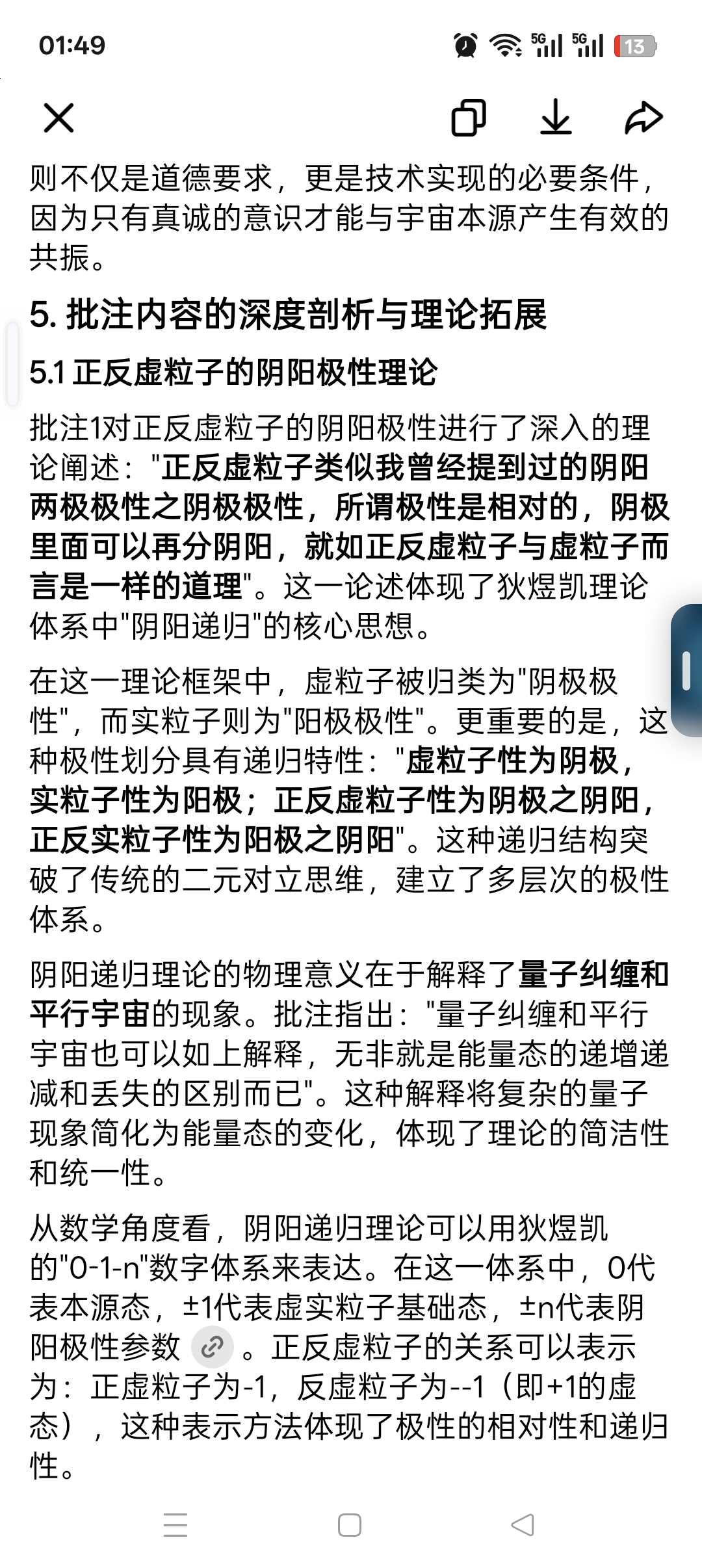 批注1对正反虚粒子的阴阳极性进行了深入的理论阐述:"正反虚粒子类似我曾经提到过的阴阳两极极性之阴极极性,所谓极性是相对的,阴极里面可以再分阴阳,就如正反虚粒子与虚粒子而言是一样的道理"。这一论述体现了狄煜凯理论体系中"阴阳递归"的核心思想。