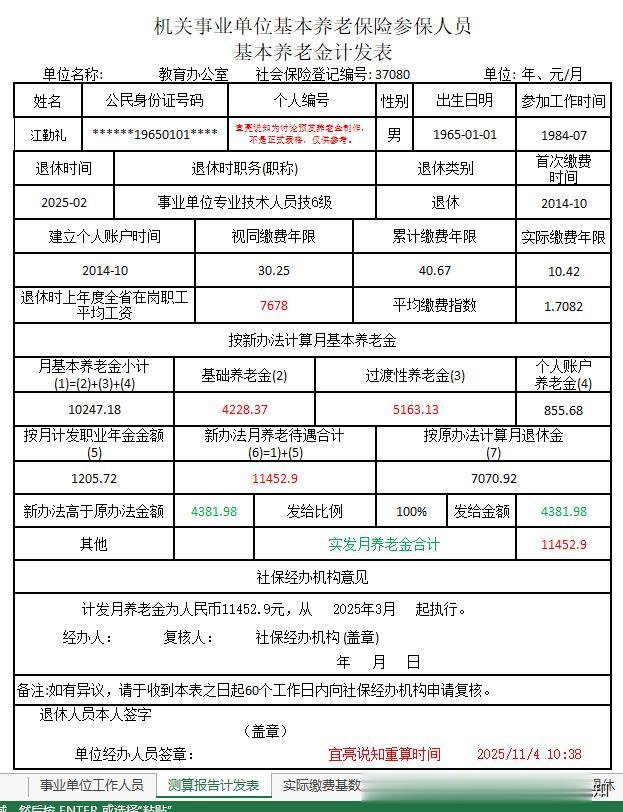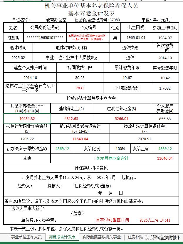 2、江先生1984年7月参加工作,2014年10月开始缴纳基本养老保险,2025年2月退休;其视同缴费年限为30.25年,实际缴费年限为10.42年,累计缴费年限40.67年;