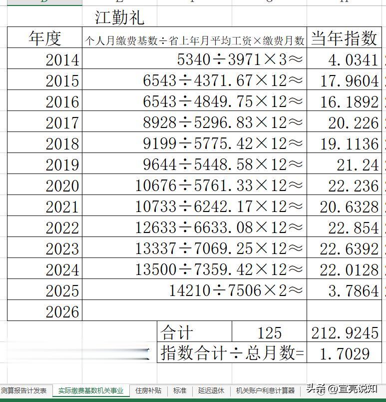 年度→个人缴费基数÷当地省缴费基准数×当年缴费月数≈当年缴费指数和