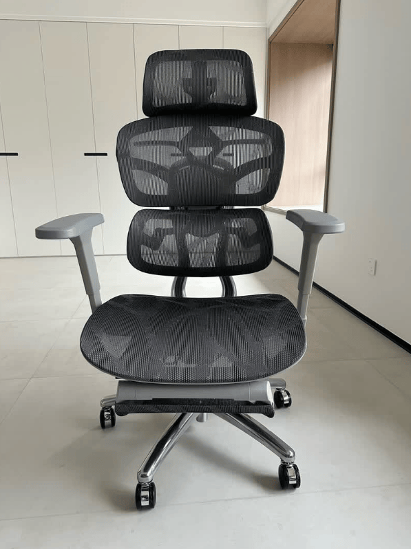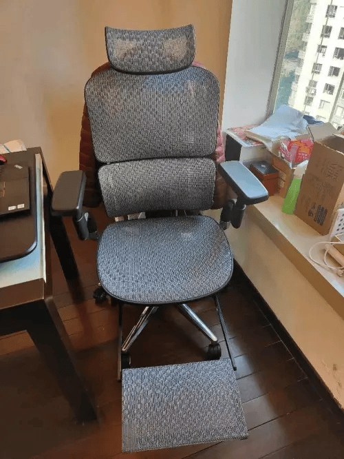 椅子是常规的工学椅造型,设计偏稳重,黑灰配色简洁,外观线条干净。骶骨支撑很贴心,腰部敏感的人坐久了也不会觉得累,腰背贴合感不错。调节功能很细致,扶手的内外摆动能精准适配打字姿势,抽拉式腿托午休时用着很方便。网布透气性够用,夏天久坐不闷汗。稍微不足的是坐感偏硬,初次使用需要适应几天,但适应后能明显感觉到扎实的承托感。