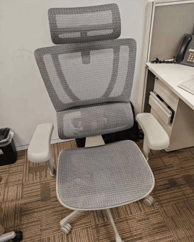 椅子是常见的工学椅造型,线条流畅,黑灰配色简约,放在办公区不突兀。三段式椅背的支撑确实舒服,腰、背、肩都能托住,整个人能放松下来,没有局部受力不均的情况。网布透气性挺好,夏天久坐也不闷汗。调节操作不复杂,不用花太多时间摸索就能找到合适的姿势。稍微不足的是新椅子会有点轻微气味,通风几天就散了,而且调节功能比较基础,追求复杂调节的话可能不够用,但日常办公用着还是不错的。