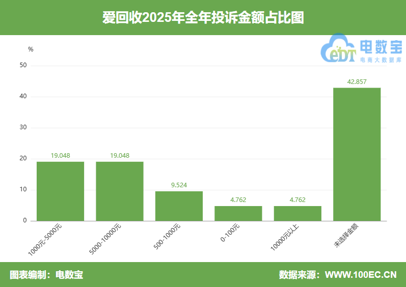 用户投诉“爱回收”的消费金额主要在1000-5000元、5000-10000元、500-1000元、0-100元、10000元以上、未选择金额区间。