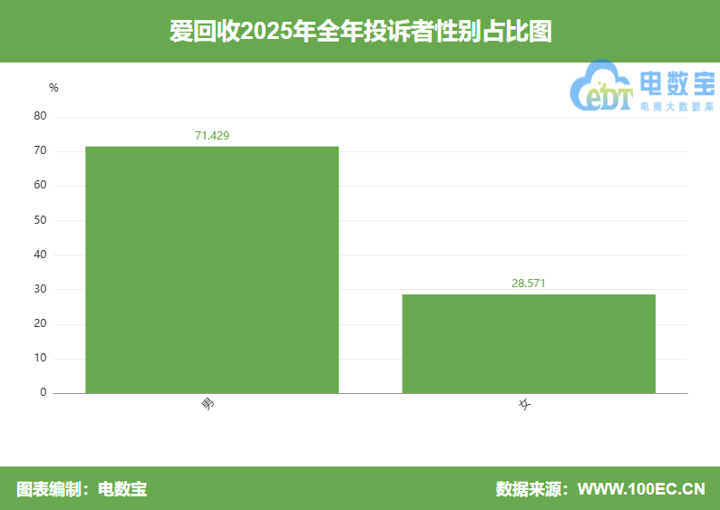 根据网经社旗下电商大数据库“电数宝”显示,投诉“爱回收”男性用户投诉比例为71.429%,女性用户投诉比例为28.571%。