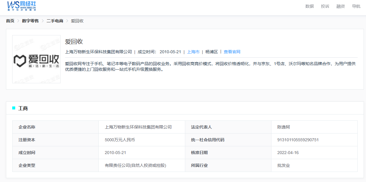 据网经社企业库显示,“爱回收”隶属于上海万物新生环保科技集团有限公司,成立于2010年5月21日,注册于上海市杨浦区,法定代表人为陈逸轲。