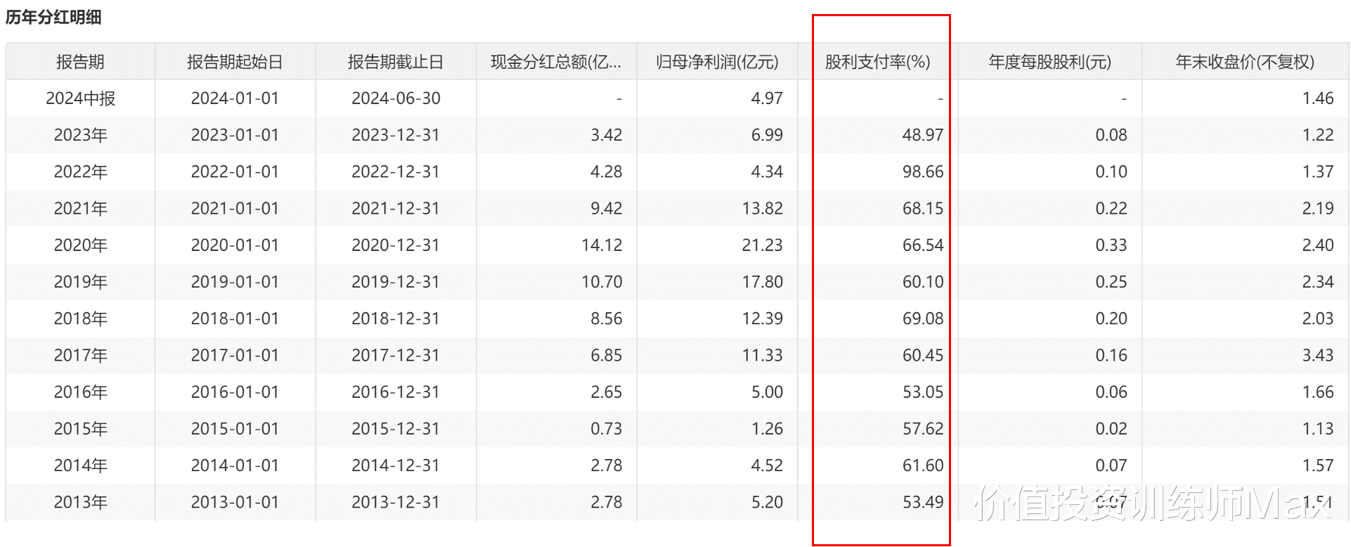 再看分红派息,2023年公司每股派息0.08港币,股价1.56港币,股息率为5.13%,不算高。公司2023年派息比率较低,仅派息48.97%。历史上,公司派息相对慷慨,如下图红色边框圈出的部分,派息比率大部分时期高于60%,甚至达到过100%的情景。如果公司2024年年报提高派息比率,简直完美。假设2024年公司派息比率提高至50%,则股息率为8%,如果派息比率提高至60%,则股息率接近10%。