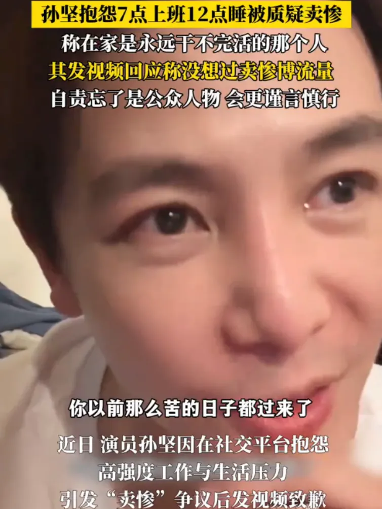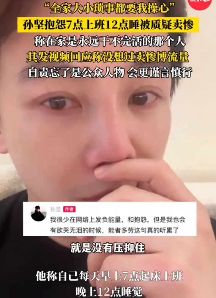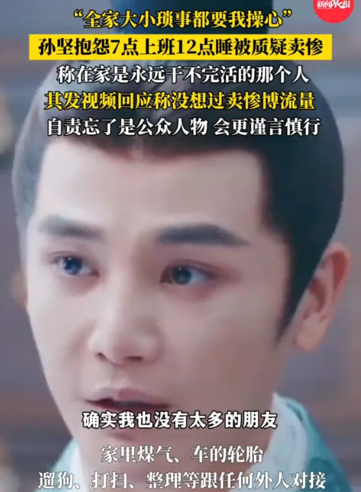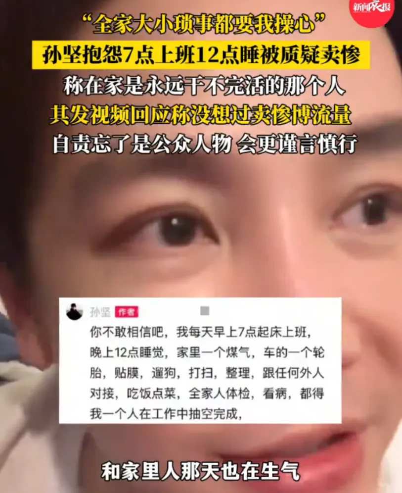 “早上7点起床,半夜12点睡觉,家里从贴膜、遛狗到全家看病全找我——能者多劳?这话我真听累了!”演员孙坚一条抖音视频,瞬间引发两极评论。有人心疼:“明星也逃不过中年顶梁柱的命!”更多人火大:“日入百万喊累?普通人天天这么过找谁说理!”