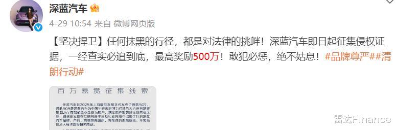为此,深蓝汽车宣布,其将设立“捍卫基金”,全面启动维权计划。相关线索一经核实,将根据线索价值,给予最高人民币500万元的奖励。