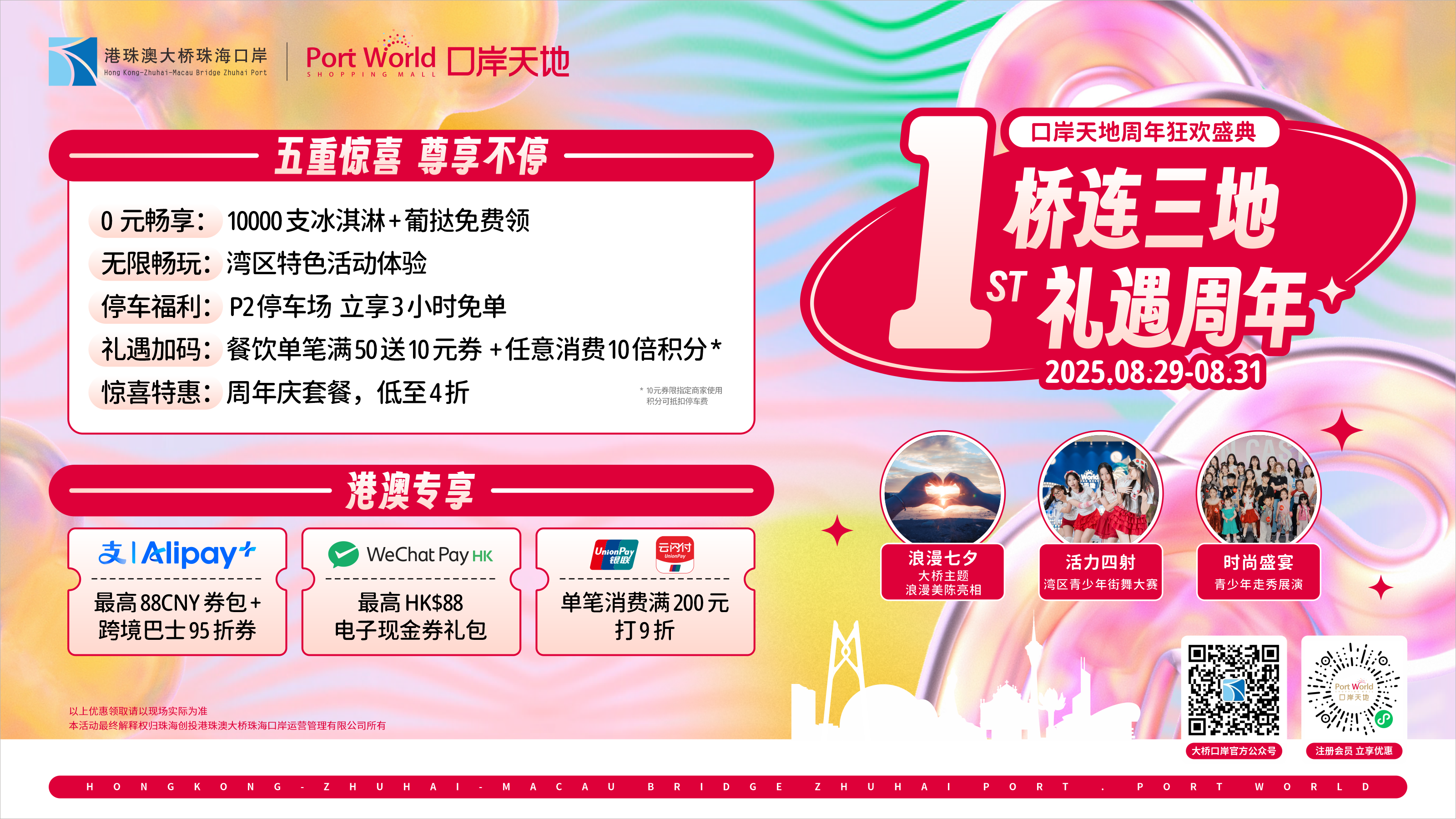 本次周年庆典以“桥连三地”为主题,精心推出“五重惊喜”消费促进举措,特别为港澳客户提供专享系列优惠。大力推广支付宝港澳版、微信香港版及银联专属优惠,带来便捷支付体验与实在让利。周年庆期间联动举办多项湾区新生代艺术活动,为大湾区青年提供展示才华的舞台。在传递青春能量、促进文化交流的同时,也切实让利消费者、激发市场活力。