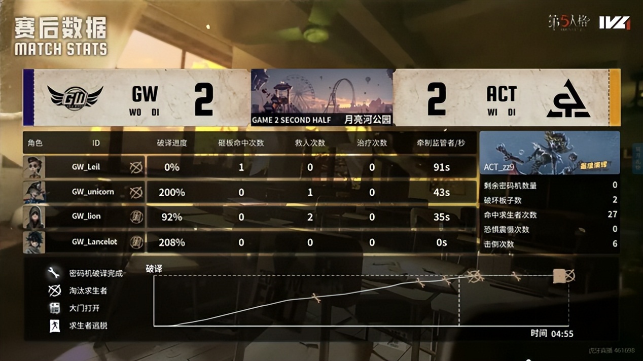 GW的求生者选择了木偶师、守墓人、飞行家、魔术师;ACT的监管者zz9选择了“跛脚羊”。(BAN幸运儿、大副、咒术师、先知)
