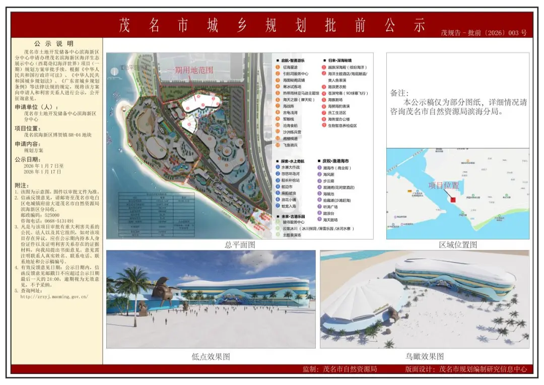 近日,茂名市自然资源局发布《茂规告-批前﹝2026﹞003号 茂名滨海新区海洋生态展示中心(西葛奇幻海洋世界)项目(一期)规划方案批前公示》