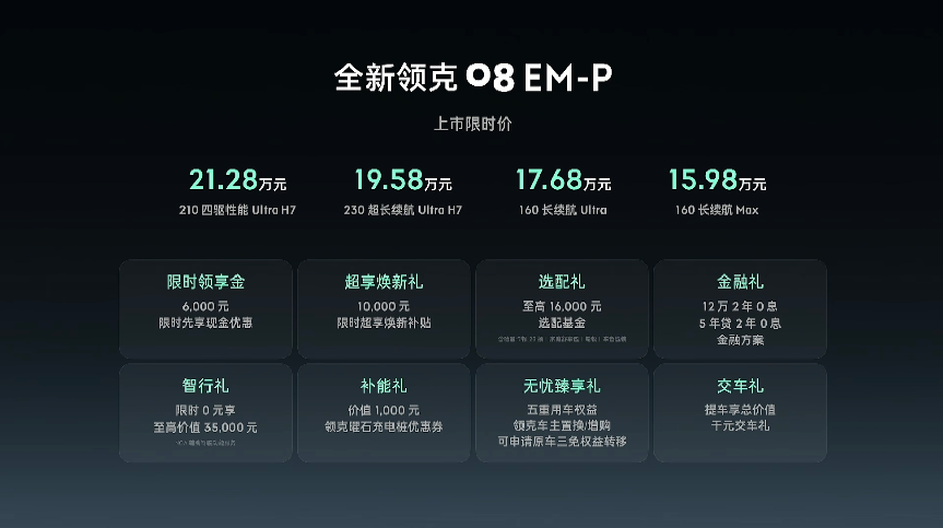 全新领克08 EM-P不仅仅是一辆交通工具,更是一个懂得平衡自我与家庭、兼顾驾趣与舒适、融合科技与温情的移动生活空间。从原创设计到宽绰空间,从贴心车机到全能辅助驾驶,从长续航到全方位安全,每一个细节都指向同一个目标——为用户开启更高品质的出行生活。