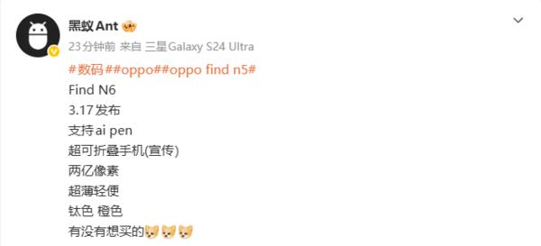 曝OPPO Find N6将在3月17日发布 搭载2亿像素传感器