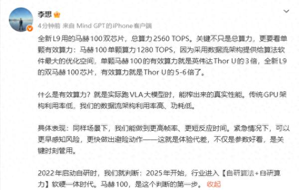 李想在发文中详细解释了“有效算力”概念:即在实际运行视觉-语言-动作(VLA)大模型时,芯片能够释放的真实性能。他对比指出,传统GPU架构利用率较低,而理想自研的“数据流架构”提供了更高的利用率和更低的功耗,从而使单颗马赫100芯片在运行大模型时的有效算力达到英伟达Thor U的三倍。